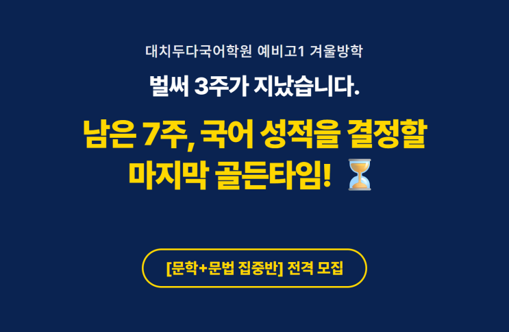 안녕하세요. 대치동 국어의 정답, 대치두다국어학원입니다. 어느덧 1월 중순, 예비고1 학생들의 겨울방학도 벌써 3주가 흘렀습니다. 지나간 3주가 수능 국어의 감을 익히는 ‘워밍업’ 기간이었다면, 지금부터 남은 7주는 고1 첫 내신 등급을 결정짓는 ‘골든타임’입니다. 대치두다국어는 3월 입학 전까지, 국어의 판을 바꾸는 7주 전략을 준비했습니다. 고1 국어 성적을 가르는 단 하나의 기준 고등학교 1학년 국어 성적은 결국 두 가지에서 갈립니다. ① 흔들리지 않는 문법 개념 ② 처음 보는 문학 작품을 끝까지 밀어붙이는 독해력 입학 후 내신 기간에 허겁지겁 개념을 잡으려 하면 늦습니다. 다른 과목 공부가 본격화되기 전, 국어 개....... <img src="https://blogthumb.pstatic.net/MjAyNjAxMTVfNTcg/MDAxNzY4NDc2MzM4OTA4.IQ3b-OAzpgfYexgVnp6tVGcEJhEI-umeXD3pskebzhcg.KKaavXGYCv70MFzS9mXsh-NBXGLYhwd38qflPK3rSxMg.PNG/image.png?type=s3" />