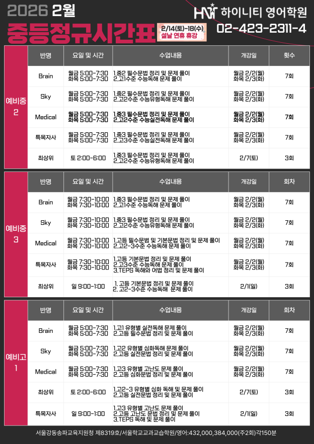 [하이니티 영어학원] 26년 2월 예비중등 정규반 개강 안내
