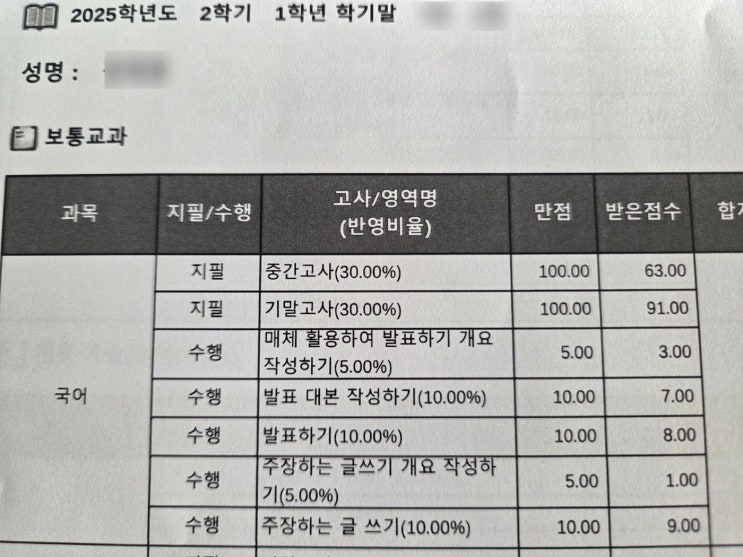 [국어의 발견] 중동중 1학년 중간고사에서 기말고사 점수 30점 상승!