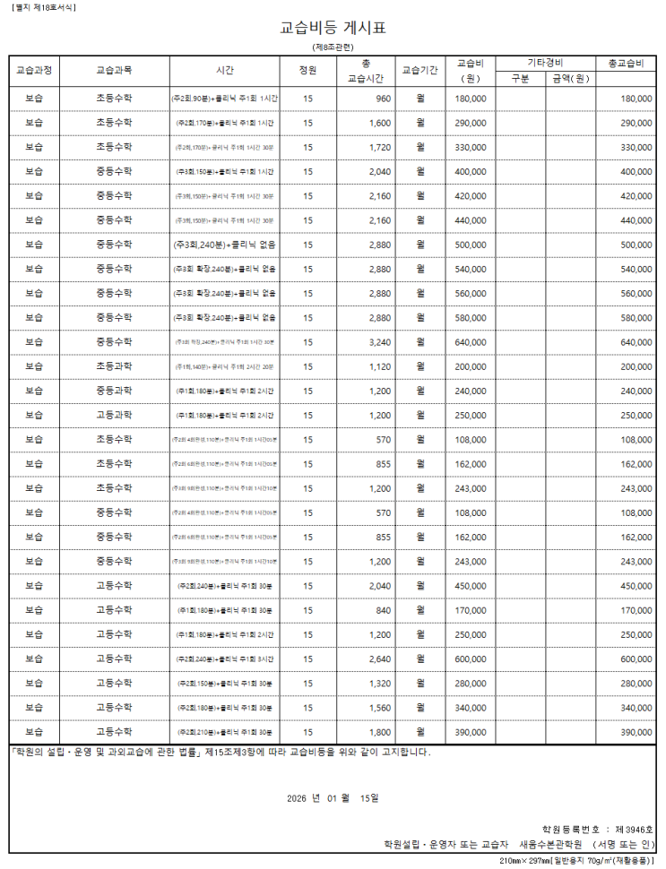 새움수본관학원<교습비>