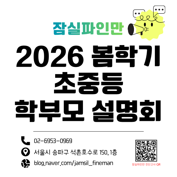 잠실파인만 봄학기 학부모 설명회 안녕하세요, 잠실파인만입니다. 올해 가장 춥다는 대한이 지나고 이제 곧 따뜻한 봄의 계절이 다가오고 있습니다. 우리 친구들의 겨울학기 수업이 거의 정점에 도달했을 것 같은데 다시 또 시작입니다. 봄학기는 기존과 달리 새로운 학년, 친구, 그리고 환경 등 많은 변화가 있는 새로운 시작이지요. 이에 앞서 우리 어머님들께도 새학기에 대한 정보를 공유해드릴까 합니다. 2월, 잠실파인만 봄학기 설명회에서 모두 공개합니다..! 봄학기 설명회 예약은 올해 올라가는 기준 학년으로 신청해주시면 되며 인터넷 예약 및 유선 예약 가능합니다 인터넷 예약은 아래 해당 링크로 신청해주시면 됩니다 ▼ 초등부 설....... <img src="https://blogthumb.pstatic.net/MjAyNjAxMjJfMTY2/MDAxNzY5MDc1MDQ1ODU5.d_4gg-C5mKHf7eOql6qp64X7IG0GISmUEd05M5OUGd8g.YS5E2Q9-E5qxgQeHp1ob2XV16Z5B6_dfy3CDe9tVB1cg.PNG/%BA%BD%C7%D0%B1%E2_%BC%B3%B8%ED%C8%B8_%C0%CF%C1%A4_%BD%E6%B3%D7%C0%CF_%282%29.png?type=s3" />