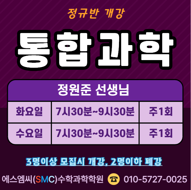 안녕하세요 에스엠씨(SMC)수학과학학원입니다. 오늘 저희학원에서는 <통합과학 신규반> 개강반을 안내드리고자 합니다. 통합과학은 고등학교 과학의 기초가 되는 중요한 과목입니다. 내신은 물론 수능까지 동시에 대비해야 하는 수능 필수과목입니다. 저희 학원은 소수정예학원으로 수년간 강의경력이 20년이 넘는 우수한 실력을 겸비한 정원준선생님 직강으로 수업을 진행합니다. 그리고 학생 개개인의 학습성향과 이해도를 꼼꼼하게 파악하여 지도합니다. 교육과정이나 진로상담이 필요하시면 언제든지 학원으로 문의주세요^^ 진로, 진학, 입시컨설팅이 포함된 학원! 1:1맞춤상담이 가능한 학원(사전예약필수)! 제대로 아는 전문가와 상....... <img src="https://blogthumb.pstatic.net/MjAyNjAzMzBfMTYw/MDAxNzc0ODY4NzY1ODAw.teF-USG0edvdfvtVA6tG9N7dKGQJs3yP1UMWlasv-KIg.JsUQ6uXgoDToesd5qtLga9VgQJRlTk68IUYgIGhoS6cg.PNG/image.png?type=s3" />