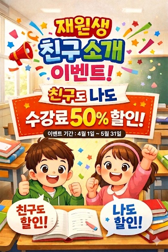 안녕하세요 비상잉글리시아이 미래엔수학 리더스학원입니다. 새학기를 맞아 우리 아이들이 더 즐겁게 공부할 수 있도록 특별한 이벤트 2가지를 준비했습니다! 1. 친구소개 이벤트 (수강료 50% 할인!) 재원생 친구가 새로운 친구를 소개해주면 소개한 친구도! 소개받은 친구도! 수강료 50% 할인 혜택을 드립니다 ✔ 친구랑 같이 다니면 더 재미있고 ✔ 학습 분위기도 훨씬 좋아져요! 이벤트 기간 : 4월 1일 ~ 5월 31일 2. 영수증 리뷰 이벤트 (메가커피 쿠폰 증정!) 학원 이용 후 영수증 리뷰만 남기면 선물 GET! ✔ 참여 방법 1️⃣ 영수증 사진 찍기 2️⃣ 리뷰 작성하기 3️⃣ 확인 후 뽑기 1회! 경품 ....... <img src="https://blogthumb.pstatic.net/MjAyNjAzMzFfMTQx/MDAxNzc0OTMwMjc3MzQ3.gX9FT1UlcQkXhjVw2yjTUe5KJfo8IBOTkXAiCW_hzYog.uEkJvdzgJzQ_-mxS-raVcyGUGEKwyy8abC-K23dqPYEg.JPEG/IMG%A3%DF6813.jpg?type=s3" />