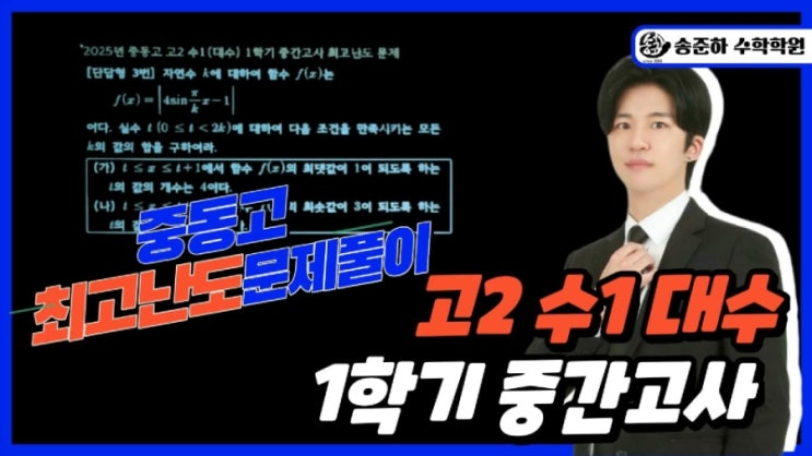 안녕하세요! 최고의 대치동수학학원 송준하수학학원입니다! 하루 1문제씩 꾸준히 매일 공부합시다! 2025년 중동고 고2 수1(대수) 1학기 중간고사 최고난도 문제풀이 오늘은 중동고 고2 수학1 1학기 중간고사 최고난도 문제를 준비했습니다! 풀어보시고 해설을 들어보세요! 항상 좋은 강의로 보답하겠습니다! <해설 강의> <손글씨 풀이> 중동고 내신대비가 필요하시다면 언제든 편하게 연락주세요! 최선을 다해 도와 드리겠습니다! #수1 #대수 #내신대비 #지수함수 #삼각함수 #로그함수 #문제풀이 #대치동 #대치동수학학원 #대치동내신대비 #대치동수능대비 #휘문고 #중동고 #보인고 #영동일고 #중대부고 #단대부고 #진선여고 #경기여....... <img src="https://blogthumb.pstatic.net/MjAyNjA0MDFfNjAg/MDAxNzc1MDUxNzE5ODI1.mj6LnCH3WqeSfjhNimA4u-oQF89m3ICGGzZiYbT9GrUg.FTnykMHIt4cj5OBGGjOzybcGR4Isk-0Tq7DaEXAh3NMg.JPEG/900%A3%DF%C3%D6%B0%ED%B3%AD%B5%B5%A3%DF%C1%DF%B5%BF%B0%ED%A3%DF%B0%ED2%A3%ADCover.jpg?type=s3" />
