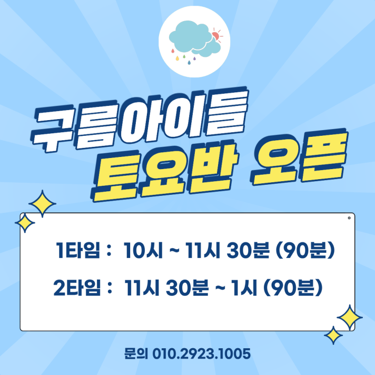 안녕하세요 한티역 대치동에 위치한 구름아이들 미술 학원입니다^^ 구름아이들에서는 아이들의 자기주도적인 작업 진행과 다양한 재료를 접할 수 있도록 수업이 진행됩니다. 조형작업만 진행되는 것이 아닌 드로잉도 함께 진행됩니다 토요일반 첫 개설 안녕하세요 구름아이들입니다^^ 그동안 토요일반 문의가 꾸준히 있었지만, 외부수업 및 원데이 클래스 일정으로 개설이 어려웠습니다. 5월부터 토요일반 개설이 가능하게 되어 안내드립니다. 수업은 총 2타임 90분수업으로만 진행되며 8세부터 수업참여가 가능합니다. 4월부터 모집을 진행후 수업은 5월부터 시작됩니다. 토요일 수업 관련 문의 궁금하신점 편하게 연락주세요 평면을 입체, ....... <img src="https://blogthumb.pstatic.net/MjAyNjAzMzBfMTE3/MDAxNzc0ODQ3NzE1Mzkz.Xhu3s5XwJQLZ40s-ILgnxiWgzii9-ijKsqQ-Rs65cusg.xPSYxN-oNxqUGlGUr0ER9WEKXE4AxOac2bsFaY1GKlAg.PNG/%C1%A6%B8%F1%C0%BB_%C0%D4%B7%C2%C7%D8%C1%D6%BC%BC%BF%E4..png?type=s3" />