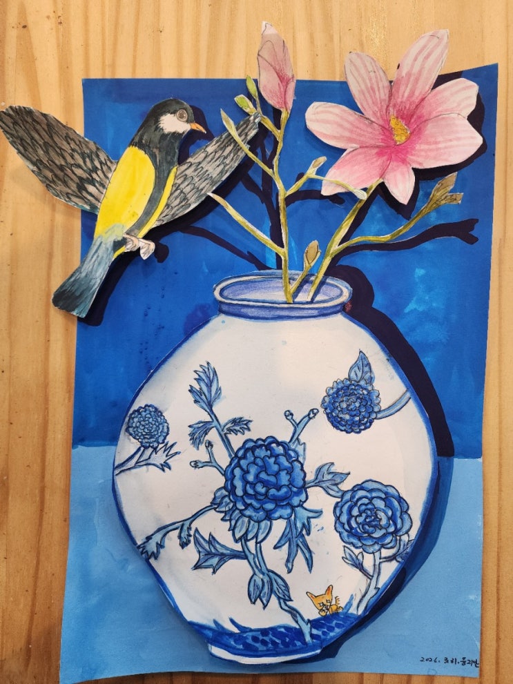 지.감 3-4 청화백자로 보는 봄 다양한 청화백자와 봄을 알리는 매화 꽃 가지와 새를 관찰한 후 자세히 표현해 보는 수업을 진행했어요. 초등 3~4학년들 친구들의 경우 구체적 조작기로 다양한 형태들을 표현하는데 큰 어려움이 없어요. 뿐만 아니라 자기조절력이 어느정도 가능하기 때문에 채색이나 구도를 잡고 작품을 계획하는 것도 가능한 시기라고 할 수 있어요. 그래서 화면을 채우는 사이즈로 청화백자를 그리고 배경을 평면이지만 색의 조합을 통해 입체적으로 보일 수 있도록 수업을 구성했습니다. 생각하는미술관의 교육은 특별합니다. 홍당무아줌마의 생각하는미술관 홍당무아줌마의 생각하는미술관 홍당무아줌마의 생각하는미술관 홍....... <img src="https://blogthumb.pstatic.net/MjAyNjA0MDRfMjQw/MDAxNzc1MjkxNjA1ODY2.v7ultSdARVdYIRac5IrJgiAcOIOQznyV1EoXz5a7uDIg.ZjodXbc67-DGrmwAo4-XaBjquXY0h9ow0Z9FHETc9eEg.JPEG/1775291604312.jpg?type=s3" />