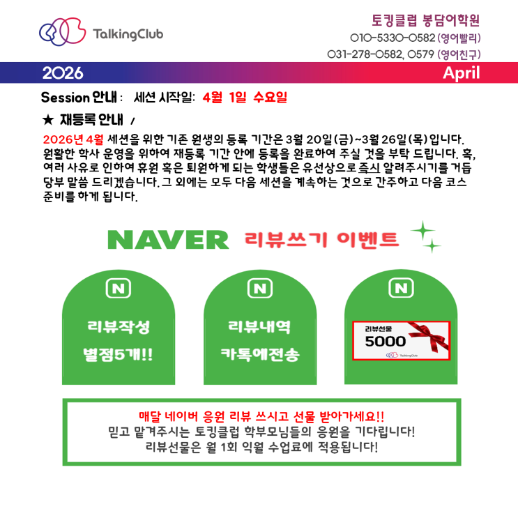 『토킹클럽 화성봉담어학원』 4월 가정통신문