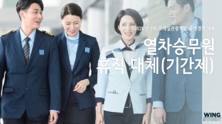 안녕하세요. 윙스토리입니다. 2026년 코레일관광개발 열차승무원 1차 채용이 진행 중인데요! 오늘 윙스토리에서는 열차승무원 지원자분들에게 조금이나마 도움이 되었으면 하여 자기소개서 작성 TIP을 공유해 보려고 합니다. 2026년 1차 열차승무원 기간제(휴직 대체) 채용 소식 또한, 지난 2025년 3차 채용에서 예비합격을 받으셨던 윙쓰분의 최종합격 소식도 함께 전달드립니다. 먼저 예비합격자분의 최종합격 소식입니다. 지난 2025년 10월 3차 정규직/청년인턴 채용에서 KTX·부산(청년인턴)직 예비합격을 받으셨던 윙쓰분께서 금일!! 최종 합격 연락을 받으셨습니다. 너무 축하드립니다!! 남은 건강검진 잘 받으시고 뜻깊은 인턴생활 최선을....... <img src="https://blogthumb.pstatic.net/MjAyNjAxMTlfMTE0/MDAxNzY4ODMwNDM0OTIw.WMBet7Qhvx85vcqw8IFyvOZ91kGD4HygfGyNhlE9foQg.-oVaCJ6w5d_Bot-OsRi72ruEWYVJ_gQJEVMWnciL3jcg.PNG/2026%B3%E2%C4%DA%B7%B9%C0%CF%B0%FC%B1%A4%B0%B3%B9%DF%C3%A4%BF%EB.png?type=s3" />