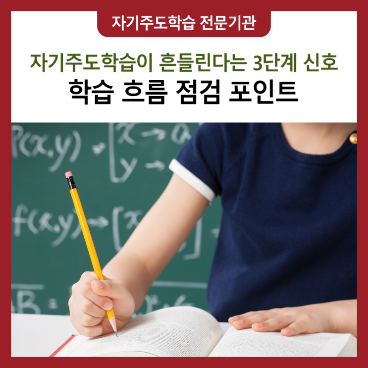 “계획도 세우고 공부도 하는데, 왜 점점 버거워 보일까요?” 자기주도학습을 하고 있는 학생일수록 이 질문은 더 복잡해집니다. 공부를 안 하는 것도 아니고, 노력하지 않는 것처럼 보이지도 않기 때문입니다. 하지만 습 흐름이 흔들릴 때는 눈에 잘 띄지 않는 신호들이 먼저 나타납니다. 이 신호를 놓치면 공부는 계속되지만 성취감은 점점 사라지게 됩니다. 1단계: 계획은 있지만, 실행이 시작되지 않는 상태 이 단계의 학생들은 비교적 성실해 보입니다. 플래너도 작성하고 있고, 해야 할 일도 정리돼 있습니다. 하지만 하루의 실제 흐름을 들여다보면 계획 대비 실행량이 매우 낮은 경우가 많습니다. “조금 있다가 해야지”라는 말이 반복....... <img src="https://blogthumb.pstatic.net/MjAyNjAxMTlfMzcg/MDAxNzY4ODA3NzAzMjM5.AL5EkGMIaOtergMAuOOFLvV1_ULNvYQfgoGD5DuVdn0g.NPQwaE00SEBpVZClSpD8094RA1hlrKc-s0TtiYfy0SMg.PNG/0123.png?type=s3" />