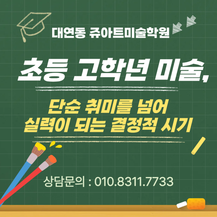 안녕하세요 대연동에 위치한 드로잉 전문 쥬아트미술학원 입니다. "그림 그리는 걸 정말 좋아하는데, 미술학원을 다녔는데 실력이 제자리걸음인 것 같아요." "이제 곧 중학생인데, 취미 미술만 계속해도 될까요?" 초등 고학년 자녀를 둔 학부모님들이 가장 많이 하시는 고민입니다. 이 시기는 단순히 '즐거운 그리기'에서 벗어나, 자신의 생각을 정확하게 표현할 수 있는 '실력'을 갖춰야 하는 중요한 전환점입니다. 왜 '쥬아트미술학원'은 드로잉 중심 교육을 고집할까요? 쥬아트 미술학원은 단순 취미 미술에 머물지 않습니다. 기초부터 입시까지 탄탄하게 이어지는 교육을 목표로 합니다. ....... <img src="https://blogthumb.pstatic.net/MjAyNjA0MDFfMjA3/MDAxNzc1MDMxMzA4ODQ4.S22UAPMkRWu0PqwIph5NlTcOlrPXqw8Z50I-Aiqw0R0g.1XZBe1QvbLT6Sp-CXK6ujyUCvhopuKICN1pQ3baOdFcg.PNG/%C1%A6%B8%F1%C0%BB%A3%DF%C0%D4%B7%C2%C7%D8%C1%D6%BC%BC%BF%E4.%A3%A84%A3%A9.png?type=s3" />