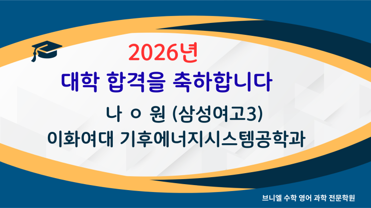 수고했어요, 그리고 정말 자랑스럽습니다. 수많은 고민과 노력의 시간을 지나 마침내 대학 합격이라는 아름다운 결과를 만들어냈습니다. 포기하지 않고 끝까지 달려온 우리 학생들의 땀과 열정에 큰 박수를 보냅니다. 여러분의 새로운 출발을 브니엘학원이 언제나 응원하겠습니다. 끝까지 해낸 당신이 자랑스럽습니다! <img src="https://blogthumb.pstatic.net/MjAyNjAyMTBfMTAz/MDAxNzcwNzI2NDk5Mjc5.JDrQUjWHy__kP6Im6Nm5zGyJUgF5p8y20Ok2nq_nFfgg.C0KCh5-wkGgMAcvG1VnaZHRVFi3Bf1mMJY0dc6FzRx8g.PNG/7.png?type=s3" />