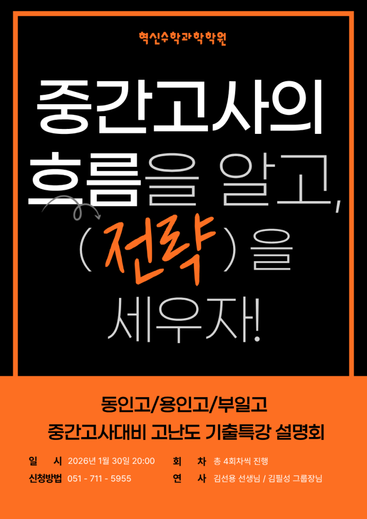 중간고사는 단순히 문제를 많이 푸는 시험이 아닙니다. 학교별 출제 경향을 정확히 이해하고, 어디서 변별이 갈리는지를 아는 것이 성적을 가릅니다. 혁신수학과학학원에서는 동인고 용인고 부일고 학생들을 대상으로 중간고사 대비 고난도 기출 특강 설명회를 진행합니다. 이런 학생 , 학부모님께 추천드립니다 "공부는 하는데 점수가 잘 안 오른다" "고난도 문항에서 항상 막힌다" "학교별 시험 스타일이 궁금하다" "중간고사 전략을 제대로 세우고 싶다" 설명회에서는 이런 내용을 다룹니다 학교별 중간고사 출제 경향 분석 실제 시험에서 나오는 고난도 유형 정리 중간고사에서 점수를 가르는 핵심....... <img src="https://blogthumb.pstatic.net/MjAyNjAxMjFfMTg4/MDAxNzY4OTY0MzUyNTQy.Zkcsc-3kjmFhDGQG--ug-IQIva_UOqWY1Z3KYIcQu3Mg.CaIUAHugLdQ2vBJ3mSn34ccBrrThfaWzXVne83OrBUMg.PNG/%C1%A6%B8%F1%C0%BB_%C0%D4%B7%C2%C7%D8%C1%D6%BC%BC%BF%E4._%2825%29.png?type=s3" />