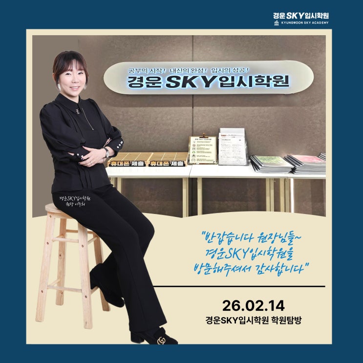 반갑습니다, 원장님들! 경운SKY입시학원에 오시는 것을 환영합니다. 2월의 어느 멋진 날, 교육에 대한 뜨거운 진심을 가진 원장님들을 제 공간에 모시게 되어 영광입니다. 저희 학원의 시스템과 운영 방식을 보러 오시는 그 귀한 발걸음에 깊이 감사드려요. 아이들을 사랑하는 마음, 더 잘 가르치고 싶은 열정은 어느 곳이나 매한가지겠지요. 저희 학원의 작은 노하우들이 원장님들의 학원 운영에도 기분 좋은 영감이 되기를 바랍니다. 맛있는 다과와 함께 따뜻한 이야기 많이 나누고 가셨으면 좋겠습니다. 감사합니다! 지금 바로 상담을 원하시면 CLICK! <img src="https://blogthumb.pstatic.net/MjAyNjAyMTNfMTc2/MDAxNzcwOTQ3NTIzMDc5.tVBXMVs7y7RPomcOHtAuWa0dEKyeqhw1OFOmvFHWsusg.GX_Vn61hoQugd0AbOBl415UrjzLIatyYbxHAs9tVf9Eg.JPEG/1770947512291.jpg?type=s3" />