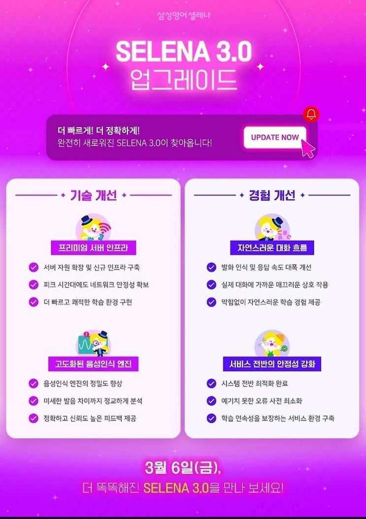 ✨ AI 셀레나 3.0 업그레이드 소식 ✨ 안녕하세요 개별 맞춤 수업의 완성, 끝판왕!! 삼성영어 셀레나 봉덕 효명 영어교습소 영어교육전문가 원장 ANI입니다 우리 아이들의 든든한 학습 파트너, AI 셀레나 선생님이 3.0 버전으로 새롭게 업그레이드되었습니다! 이번 업그레이드는 별도의 설치나 설정 없이 기존처럼 수업만 진행하시면 자동으로 적용됩니다 무엇이 달라졌을까요? ✔ 더 빨라진 응답 속도 ✔ 더 정교해진 음성 인식 ✔ 실제 원어민과 대화하는 듯한 자연스러움 이제 아이들이 더 재미있고, 더 몰입해서 영어로 말하는 경험을 할 수 있습니다 특히 예전보다 훨씬 자연스러운 대화 흐름으로 아이들....... <img src="https://blogthumb.pstatic.net/MjAyNjA0MDNfOTkg/MDAxNzc1MTk1MzI2NjE2.8kaoK-aA-87NE5gSo8K4KeUpWDFE2pch-oppSBwGszgg.C_4vR5rYmYLv_jr6fmyNqSGVMjtUp7KmurVyzjE_f1Eg.JPEG/1775028638620.jpg?type=s3" />