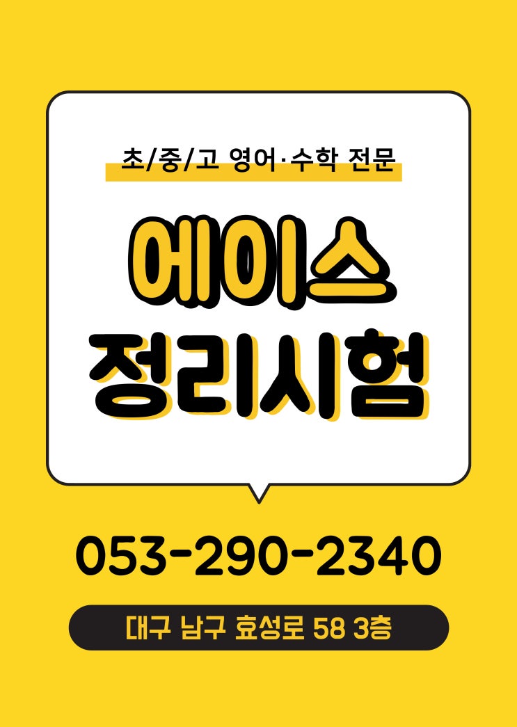 안녕하세요 경일여중과 봉덕초등학교 인근에 위치한 초중고 영어 수학 전문 에이스 학원입니다! 오늘은 에이스의 정리 시험 대해 소개해드리려고 합니다 영문법은 개념을 배우는 것보다 복습이 더 중요하다고 할 수 있습니다! 수업이 끝나고 가정에서 스스로 복습하는 과정도 매우 중요하지만 에이스에서는 수업을 하는 동안에도 복습을 할 수 있도록 정리시험을 치고 있습니다. 먼저 진도를 나가기 전 학습할 부분의 요점을 필기하며 오늘 배울 개념을 가볍게 정리합니다. 그리고 추가로 필기가 필요한 내용을 꼼꼼히 학습하며 문법 개념을 배웁니다. 개념을 학습한 뒤 선생님과 함께 문제를 몇가지 풀어보면서 오늘 배운 문법이 문제에....... <img src="https://blogthumb.pstatic.net/MjAyNjAxMjhfMTM2/MDAxNzY5NTg2NzE4ODcy.y7znKwru7_t30q8CAY9ynRuwysBp4erJbIoo4YdlTlog.dXTKBEHqADr4ofezTT9UM7jpuvs4-Wvp0nL6wh-gl3wg.JPEG/1.jpg?type=s3" />