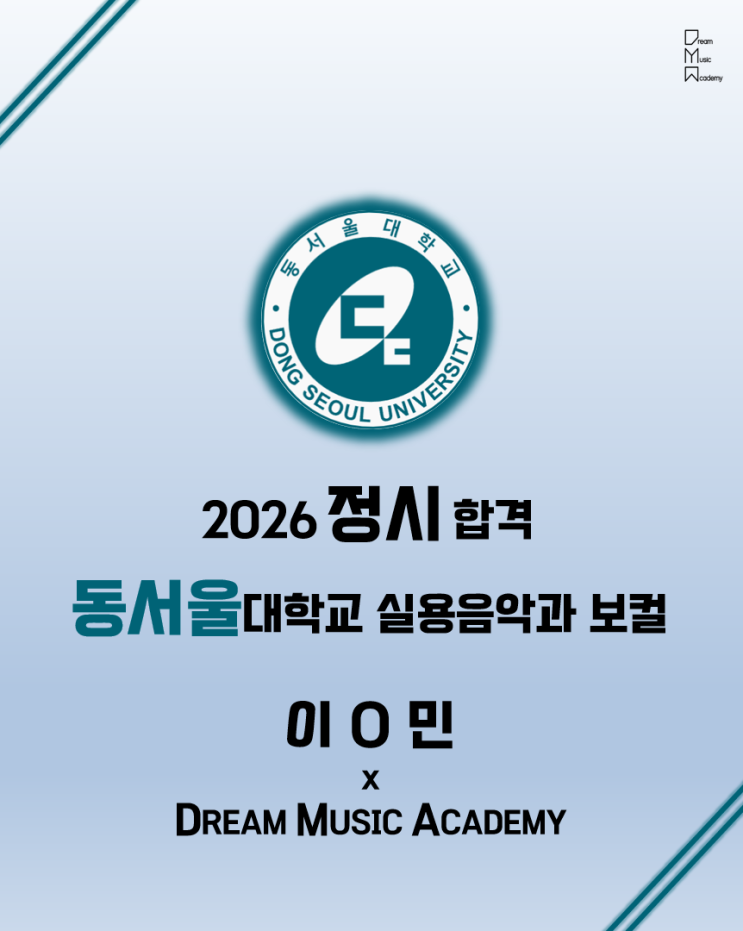 #2026 #동서울대학교 #실용음악과 #보컬 #합격 #대구보컬학원 #대구보컬입시학원 #드림뮤직아카데미 2026학년도 동서울대학교 실용음악과 보컬 합격 DMA 수강생 : 이☆민 합격을 축하합니다 입시 지도 잘 해주신 보컬 파트 : 김진용 원장님 피아노 파트 : 정민지 선생님 감사합니다 DMA에서는 체계적인 시스템과 최고의 강사진으로 실용음악과 입시 준비를 할 수 있습니다. ✔보컬 입시는❗ 역시 대구 드림뮤직아카데미❗❗ 여기로 문의해 주세요 ✅우리 대구 드림뮤직아카데미 에서는 음악 취미, 전문, 오디션, 입시 등 모든 과목을 체계적으로 배우고 준비할 수 있습니다! 대....... <img src="https://blogthumb.pstatic.net/MjAyNjAxMzBfODcg/MDAxNzY5NzUwNTUzMTAx.VBtwyk2nXLKJ0lb1nnqyZHI7hPzMs7m_PF1n0506nf4g.NWxIqpPmLf_Mz34sgeMH7IJnM_G7OtthV2Ej7Cc7ct4g.PNG/%C4%B8%C3%B3.PNG?type=s3" />