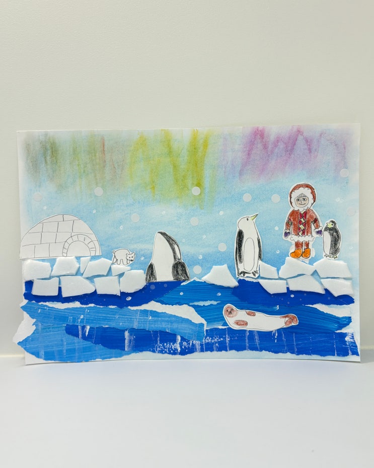 겨울을 맞아 북극과 남극의 기후, 자연환경, 동물들의 삶을 관찰한 뒤 그 환경에 어울리는 땅과 풍경, 인물을 미술로 표현해 봤어요. '추운 지역에 사는 동물들의 특징은 뭘까?.' '추위를 이겨내는 아이템은 어떤 것들이 있을까?.' '환경에 맞는 전통 의복은 어떨까?.' 다양한 발문을 통해 오늘의 주제를 탐색해 보고 재밌게 미술활동을 해봅니다. 그림 그리는 걸 정말 싫어하는 친구의 작품이에요. 늘 "못 그려요." "안 그릴래요."라고 말하며 연필 잡는 것을 거부하곤 하는데요. 환경자료를 관찰하며 열심히 배경을 완성한 아이에게 "이 멋진 배경에 동물 한 마리만 초대할 수 있다면....... <img src="https://blogthumb.pstatic.net/MjAyNjAyMDJfOTEg/MDAxNzcwMDA1ODEwNDg0.0lM7qobW-um5BUyW_Vl0oeLUOJWcWkcyM3zivnetsUwg.zJ5MpWSaiBdRf0g8FzYc4d0oepRl7-uCyNcwcVFLqs8g.JPEG/KakaoTalk_20260202_130945329.jpg?type=s3" />