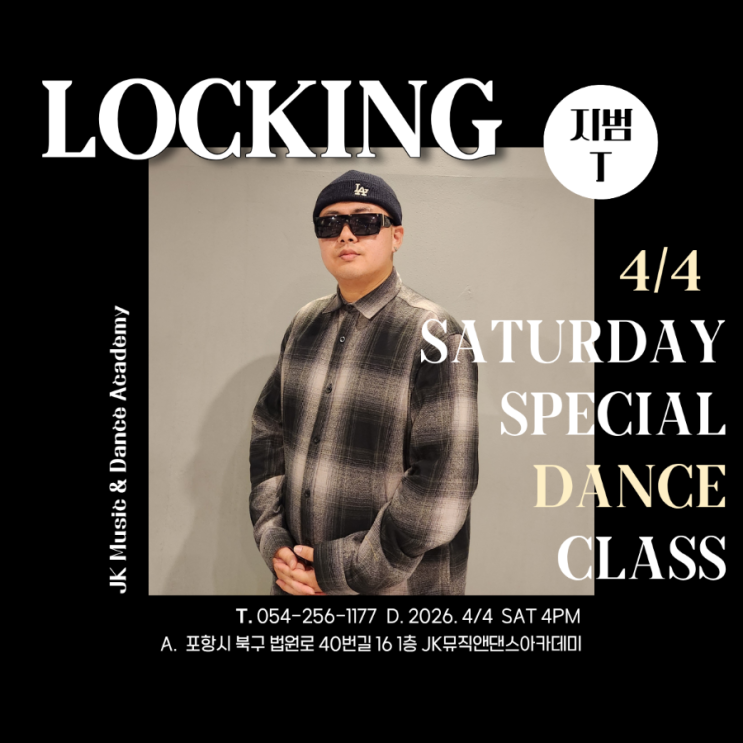 4/4 SATURDAY ONE DAY CLASS 락킹 댄스 워크샵 (Locking Dance Workshop) 지금 아니면 놓치는 단 하루 클래스. 락킹 특유의 그루브와 스타일을 제대로 느끼고, 몸에 바로 가져갈 수 있는 실전형 수업으로 진행됩니다. 단순 체험이 아닌, 퀄리티 있는 움직임과 디테일을 확실하게 가져가는 시간 일시 : 4월 4일 (토) 오후 4시 장소 : 포항시 북구 법원로 40번길 16 1층 JK뮤직앤댄스아카데미 준비물 : 실내운동화 수강료 : 10,000원 / JK수강생은 무료 키즈도 신청가능 -> 초등학생부터 가능합니다:) ✨강사 : 지범T ✨@jb_python1987 KEEP DANCING VOL.9 우승 POPPIN GRANDPRIX 우승 ALL ROUND PLAYA 우승 SDF BATTLE심사....... <img src="https://blogthumb.pstatic.net/MjAyNjA0MDJfMzQg/MDAxNzc1MTA5MTQwNjE2.tBfbyyL-e1L4VXcD8eX35cC6ZNmuf1BVBHuc4T-d5_Ag.SEpi8z9sajmkmM95BqM6qFMNl3NwNIlFjcjnjT4nIHcg.PNG/900%A3%DF1774681168816.png?type=s3" />