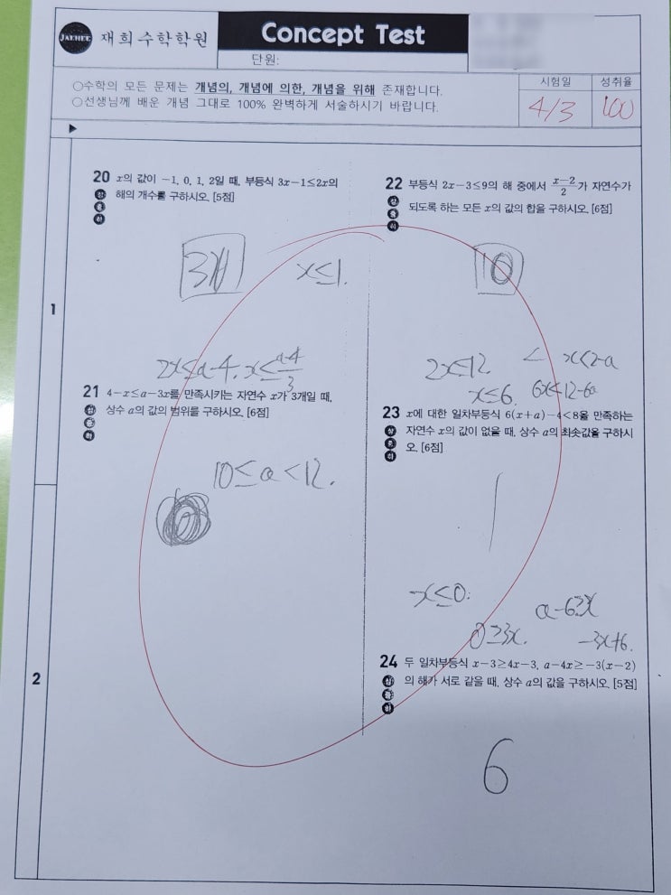 [침산동 수학학원] 재희수학학원 4월 3일 개념테스트