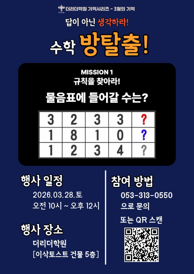 안녕하세요. 더리더학원입니다. 이번 주 토요일, 더리더학원에서 아이들과 함께할 수 있는 작은 방탈출 이벤트 ‘3월의 기억’을 준비했습니다. 일시: 2026년 3월 28일(토) 오전 10시 ~ 11시 장소: 더리더학원 . 참여 이벤트: 방문해주시는 학부모님께 몬스터커피 음료 1잔을 준비했습니다. 이번 행사를 준비한 이유는 아주 단순합니다. 저는 아이들에게 단순한 간식 하나, 일회성 이벤트 하나보다 조금 더 오래 남는 좋은 기억을 주고 싶었습니다. 생각해보면 사람은 어릴 때 경험했던 즐거운 순간들, 누군가 정성껏 준비해준 시간들, 그 안에서 느꼈던 설렘과 성취감으로 자라나는 부분이 분명히 있습니다. 저 역시 어릴 때의 멋진 기억들이 지....... <img src="https://blogthumb.pstatic.net/MjAyNjAzMjNfMjg1/MDAxNzc0Mjc3MTI1MDg1.SZVRCO0D8fMajpBdQumBNxZ63wzSiLKqOIb42hsMXiog.bux1IwQheWFrYNzyJu0FnElx6oOUL9JWxNfVd4BUAF8g.PNG/image.png?type=s3" />