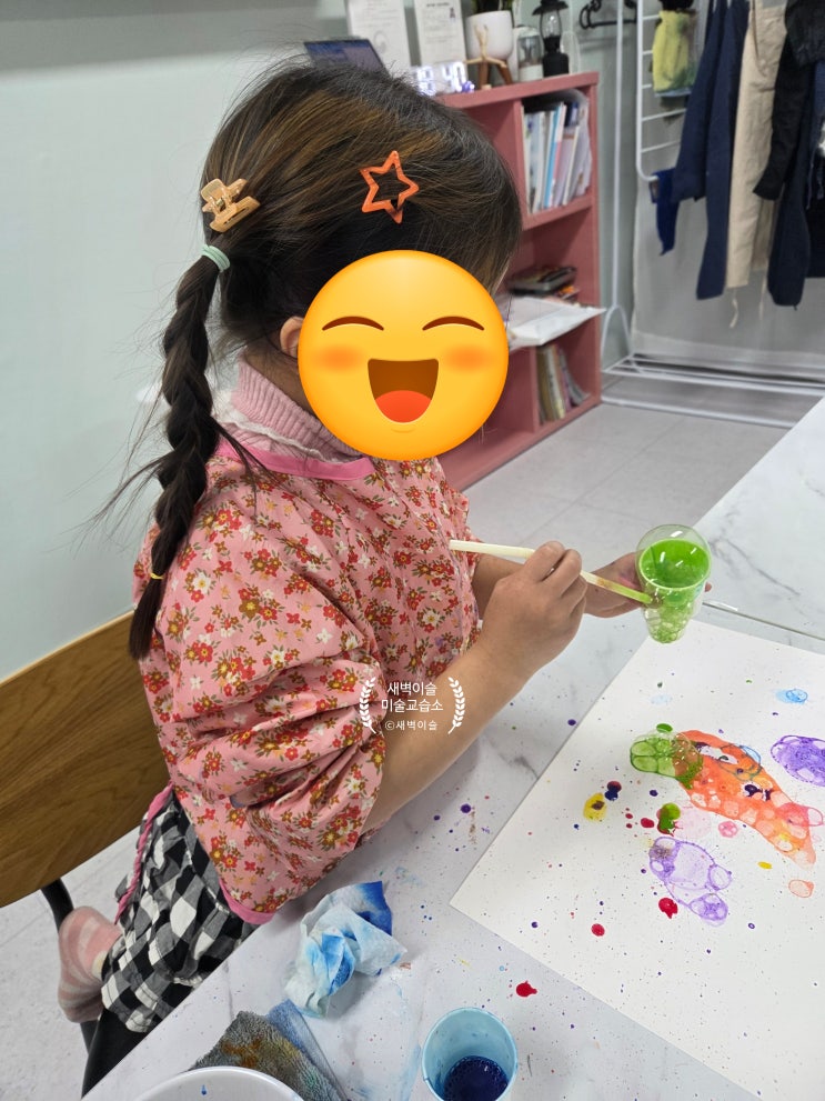 안녕하세요, 새벽이슬 미술교습소입니다! 오늘은 우리 아이들이 기다리고 기다리던, 재미있는 소리가 가득한 '거품 미술' 시간을 가졌습니다. 거품이 그림이 된다고요? 비눗방울 놀이는 아이들이 가장 좋아하는 놀이 중 하나죠? 이 익숙한 놀이를 미술과 접목하면 아주 훌륭한 '우연의 효과'를 만들어내는 예술이 된답니다. 관찰력 쑥쑥! : 컵 속에서 몽글몽글 솟아오르는 거품의 모양과 터지는 소리를 관찰해요. 색채의 혼합 : 물감과 세제가 섞여 만들어진 알록달록한 거품들이 종이 위에서 서로 만나며 자연스럽게 새로운 색을 만들어냅니다. 창의적 발상 : 찍혀 나온 동글동글한 거품 자국을 보고 "이건....... <img src="https://blogthumb.pstatic.net/MjAyNjAzMjRfNDEg/MDAxNzc0MzE0MjczNzgw.m0Pz_NFpYMMweXV4B2pEXJw2Tnpx_WzHpIkXgevoT_Qg.mAyMkAB--wWwhBccmrqgQjlpom5_AmzGXHjWIqyFOVQg.JPEG/KakaoTalk_20260324_091240261_07.jpg?type=s3" />