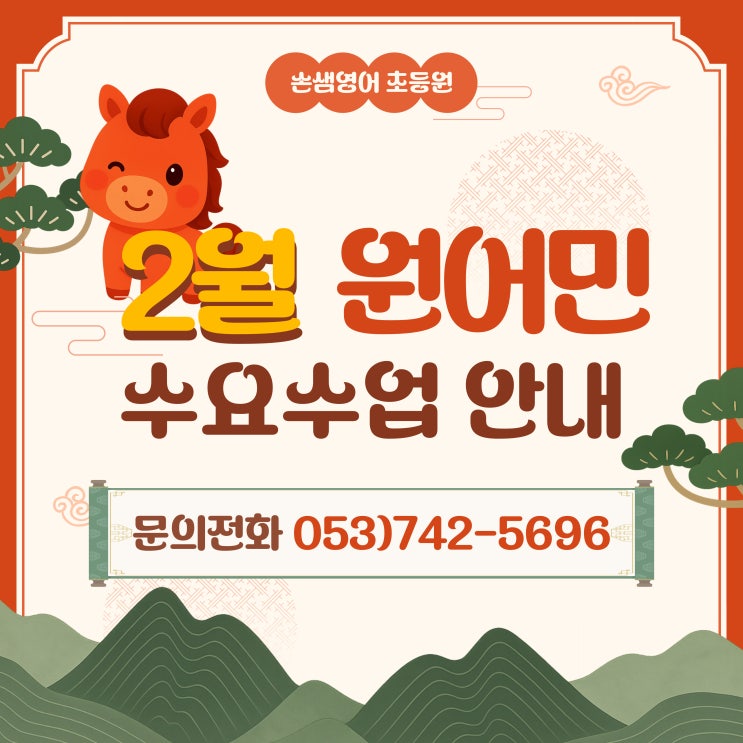 신청 기간 1/27(화) 15:00 - 1/28(수) 22:00 (기한 내 신청시에도 조기 마감될 수 있음) 신청 문의 손샘영어 초등원 053-742-5696 수강 기간 (총 2회차) ✅ 2/4 (수) 16:00-16:50 (50분) ✅ 2/11 (수) 16:00-16:50 (50분) 주의사항 선착순 조기 마감 사전 신청 필수 / 당일 신청 불가 원활한 수업 진행을 위해 지각 입실 불가 https://sonsam.co.kr/ <img src="https://blogthumb.pstatic.net/MjAyNjAxMjJfMjg3/MDAxNzY5MDkxMjkwNDc0.5RulDIpItn1ovhlDE0lZUpa5H3UYSvtyo8s8dL_UOnIg.5FYTpeB3B5BDGPiIYdWXqwmmjAY17koGcMoA5Mwyn5kg.JPEG/2%BF%F9_%BF%F8%BE%EE%B9%CE_%BC%F6%BF%E4%BC%F6%BE%F71_%BC%D5%C1%F6%B9%CE.jpg?type=s3" />