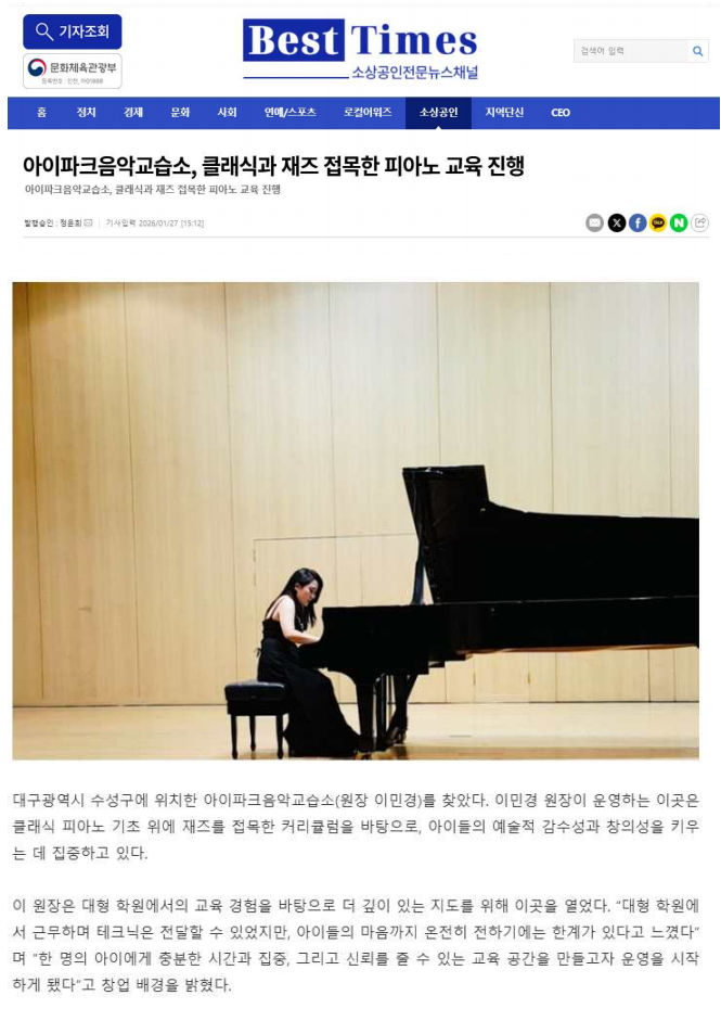 파동 수성 아이파크 음악교습소가 소상공인 온라인 신문사 베스트 타임즈에 선택되어 인터뷰를 진행했습니다. 언론이 주목한 피아노 교육 이야기 학생들의 마음을 먼저 이해하는 수업 기초부터 차근차근 쌓아가는 음악 교육 "아이파크음악 교습소, 클래식과 재즈 접목한 피아노 교육 진행 " 기사로 전해진 아이파크음악 교습소의 진심을 확인해 보세요. 대구 수성구 파동 피아노 교습소 아이파크음악입니다! <img src="https://blogthumb.pstatic.net/MjAyNjAxMjhfNTAg/MDAxNzY5NTgxOTU3Njk4.8dqzu6Ab9RCMC4KTM1SbmNPFWNMS2mRdmPuGl1-p_VMg.aySAs3SC2ENe0YqhXpKoKNVJRJ404__6BdEiPyhfcWQg.PNG/image.png?type=s3" />