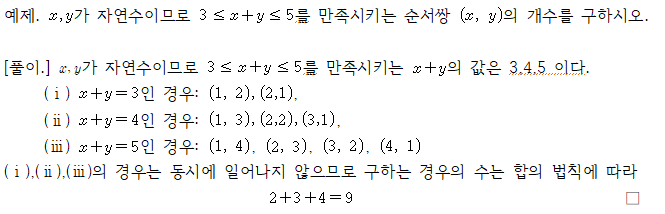 '경우의 수'는 공식 암기보다 상황에 대한 정확한 분류와 선택의 기준을 잡아야 한다. 많이 헷갈려 하는 '순서의 유무'를 중심으로 명확히 구분하는 것이 중요하다. 1. 경우의 수 경우의 수의 시작은 합의 법칙과 곱의 법칙을 구분하는 것이다. ∙ 합의 법칙 (두 사건 A, B가 동시에 일어나지 않을 때) : 사건 A, B가 일어나는 경우의 수를 각각 m, n이라고 하면 사건 A 또는 사건 B가 일어나는 경우의 수는 m+n이다. ∙ 곱의 법칙 (두 사건 A, B가 동시에 일어날 때) : 사건 A가 일어나는 경우의 수가 m, 그 각각의 경우에 대하여 사건 B가 일어나는 경우의 수가 n일 때, 두 사건 A, B가 잇달아(동시에) 일어나는 경우의 수....... <img src="https://blogthumb.pstatic.net/MjAyNjAzMjNfMTE3/MDAxNzc0MjQzMTAyNTA2.cpWFl12RQl2mEEhBvD_BmgquLQXtmQXuRIRBle-UfXQg.ITCXgQsJ-NXaMH49pCZRv8b8Qb4qDwn53emvby31Mx8g.PNG/image.png?type=s3" />