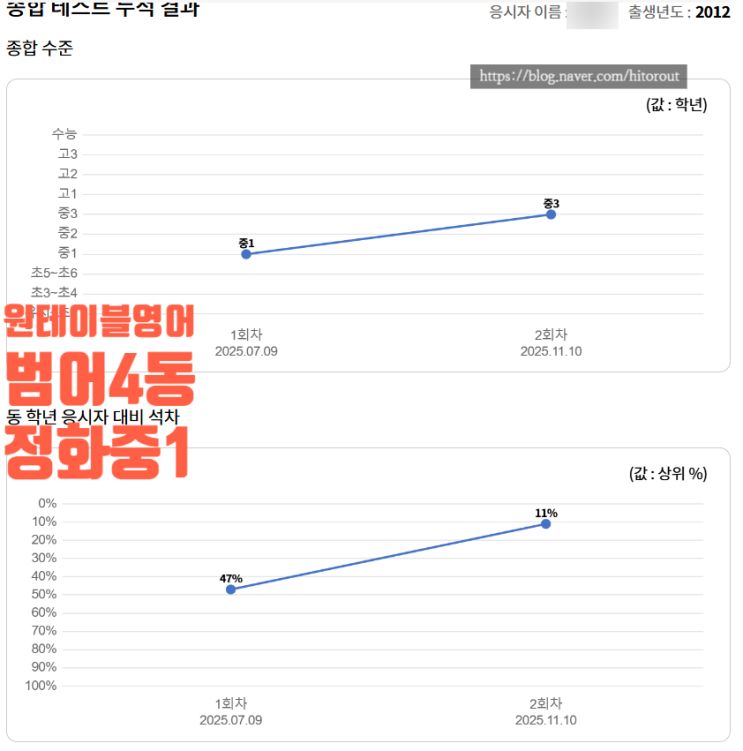 2025년초에 서울에서 전학 온 정화중1 ㅅ** 이야기입니다. 첫 상담때 기존 학습의 정도를 여쭈어보니 어머니께서 전화영어로 영어를 시작하여 몇년동안 전화영어만 시키다가 대구와서 어떤 교습소를 몇 개월다닌 것이 전부라고 하셨습니다. 그리고 지인의 소개를 받아 연락을 주셨습니다. 저는 기존 학습이 너무 부족해보여서 어깨가 무거워졌습니다. 서울에는 전화영어를 그리 오랫동안 하나 싶은 것이 회화위주로만 공부를 하였을까 싶어서 걱정이 되었습니다. 아니나 다를까 첫 레벨테스트를 받아보니 전국 동학년배들의 평균 수준인 47%였고, 수성구 범어동의 실력으로는 평균이하라는 것을 의미하였습니다. 그런데도 제가 조금 놀란것이 정....... <img src="https://blogthumb.pstatic.net/MjAyNjAxMzFfMTAw/MDAxNzY5Nzg3NTYyOTA4._5a0QQZFwwYnxyorWayhZysHo_V16M4KkKYjavgHt7Ig.rSxyNyX_8vG-d15UQifxAj_4RgoY-VqwBo7oZqTB9Cgg.PNG/%BD%BA%C5%A9%B8%B0%BC%A6_2026-01-31_003447.png?type=s3" />