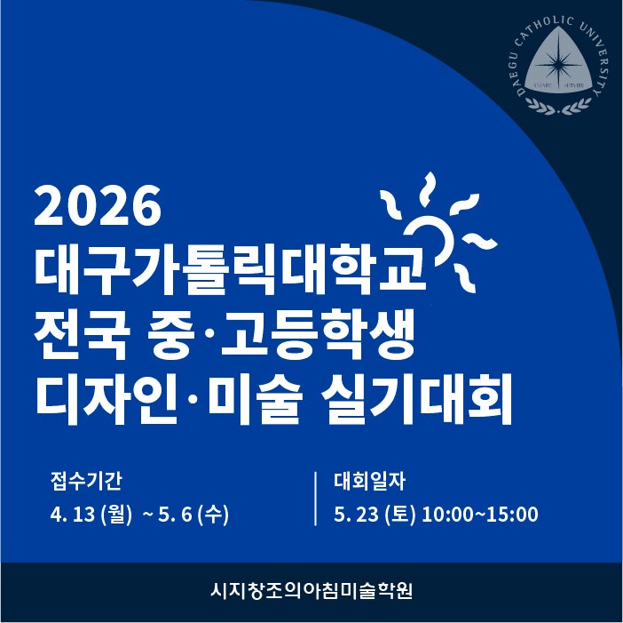 안녕하세요 시지창조의아침 미술학원입니다. 오늘은 2026 대구가톨릭대학교 전국 중,고등학생 미술실기대회의 일정과 학교 맵에 대해 소개드리려 해요 2026년 대구가톨릭대학교 전국 중,고등학생 미술실기대회 ❖ 접수 기간 2026. 4. 13 (월) ~ 5. 6 (수) ❖ 접수처 월간 아트앤디자인 홈페이지 (인터넷 및 모바일 접수만 가능) ❖ 대회장소 및 시간 대구가톨릭대학교 경산캠퍼스 / 10시~15시 (5시간) ❖ 대회일자 2026. 5 . 23 (토) ❖ 심사발표 2026년 6월 중 대구가톨릭대학교 홈페이지 ❖ 시상내용 대회 포스터 참조 ❖ 참가부문 * 고등부: 직선자(30cm), 마스킹 테이프, 콤파스, 전동지우개 외 사용 금지 ❖ 문의처 | 인터넷 접수 문의....... <img src="https://blogthumb.pstatic.net/MjAyNjAzMjRfMjAy/MDAxNzc0MzQ3MzgwNjkz.iisuWSVVvvo2UP0kmg42lmi1hFj78hcJU-hDewGxds8g.wfJufPrjQDKla5X3Thvoo2kD9o4kkV1l_DuFMjtrys8g.JPEG/%A4%A7%A4%A1%A4%A7-100.jpg?type=s3" />