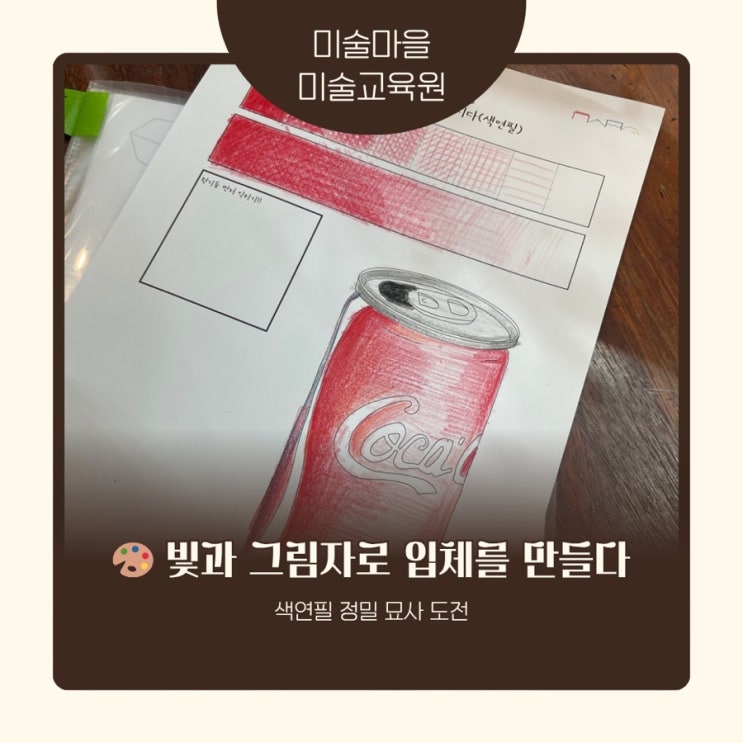 안녕하세요 우리 아이의 감성과 창의력이 자라나는 곳, 미술마을입니다 ◡̈♡ 이번 3월, 우리 5·6학년과 중등부 친구들은 조금 특별하고 수준 높은 도전을 마쳤습니다 바로 〈Scrap Book : 원뿔 + 원기둥 색연필 정밀 묘사〉 수업입니다. 1. 단순한 도형이 아니에요 : "빛과 그림자, 반사광의 원리" 원뿔과 원기둥, 단순한 도형 그리기처럼 보이시나요? 사실 이 작업은 빛과 그림자, 그리고 반사광의 원리를 이해하고 부드러운 그라데이션으로 표현해 내는 고도의 작업이에요. 사물의 본질적인 구조를 꿰뚫어 봐야 가능한 일, 쉬워 보이지만 절대 쉽지 않답니다 ✨ ✏️ 2. 평면 위에 입체를....... <img src="https://blogthumb.pstatic.net/MjAyNjAzMjdfMTE4/MDAxNzc0NTk0NjM4NDEx.pHg3VYUk-D87Q3xWWPrL1YEdvKvxR3k_AmBN15sRMPgg.pRLeiuMNASj9USaLQBbGcYf5yq5SyXxoG_qPg76Fq3Ag.JPEG/blog%A3%DFthumbnail%A3%DF.jpg?type=s3" />