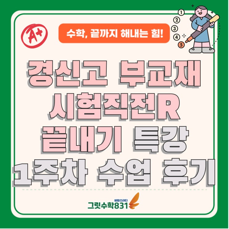 수학! 끝까지 해내는 힘!! 안녕하세요~ 수성구 범어동 내신대비 수학학원 그릿수학831학원입니다. 중간고사가 얼마 남지 않았습니다!! 모두 열공하고 계신가요? 오늘은 지난 번에 포스팅했던 학교별 부교재 특강 중 경신고1 수학 특강 1회차 후기를 같이 확인해 보시죠! 부교재 및 프린트 확실하게 끝내기 특강 소개 https://blog.naver.com/visionmaths/224220022802 중간고사 수학을 완벽 대비하기 위한 경신고1 부교재 끝내기 4회 완성 특강은 매주 수요일 6~8시에 진행되는데요, 3월25일 수요일에 첫 번째 특강이 진행됐고 중도 수강도 가능하니 많은 관심 부탁드립니다~~ 어떻게 진행됐을지 내용을 보실까요? 먼저 시험직전R교....... <img src="https://blogthumb.pstatic.net/MjAyNjAzMzBfNjEg/MDAxNzc0ODYyMTMxMzY3.V60d12Z-3n36sB5xtWAmgenQPHZIUV_-dZ2oiZq0aDMg.dviFpneo-DFBi-shtfxtlpl0JzdiXc1gY73i54couZMg.JPEG/001.jpg?type=s3" />