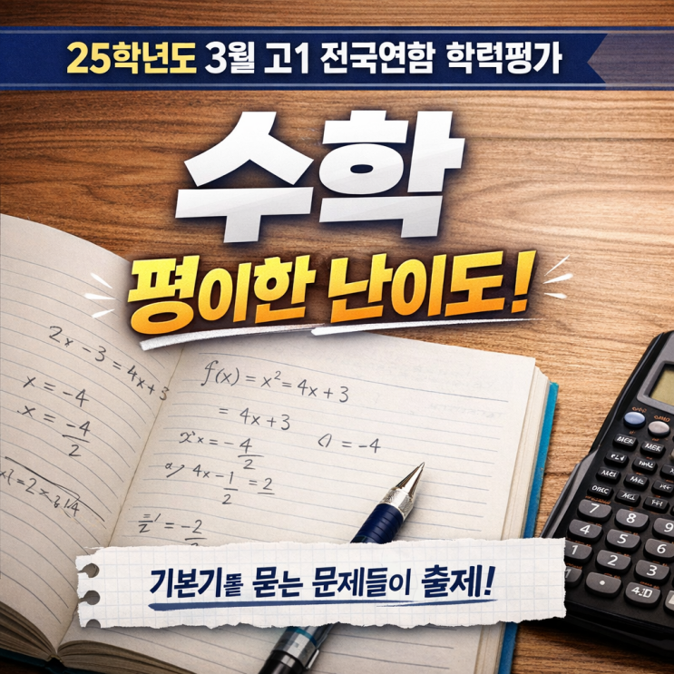 25학년도 3월 고1 수학 난이도 총평 25학년도 3월 고1 전국연합 학력평가 수학은 전체적으로 ‘평이한 난이도’로 평가된다. 중학교 과정과 고등학교 1학년 1학기 초반 개념을 충실히 학습한 학생이라면 체감 난이도는 낮았을 시험이다. 다만 문제 자체가 쉽다고 해서 방심하면 실수하기 쉬운 시험이었고, 상위권과 중위권을 가르는 요소는 계산 정확도와 조건 해석 능력이었다. 출제 범위 및 구성 특징 이번 3월 학평은 고1 학생들의 첫 전국 단위 시험답게 중학교 개념 + 고등 수학(상) 초입 개념을 중심으로 구성되었다. 주요 출제 영역은 다음과 같다. 다항식의 계산, 인수분해, 일차·이차방정식 함수의 개념과 그래프 해석 간단한 경우의 수....... <img src="https://blogthumb.pstatic.net/MjAyNjAxMzBfMzYg/MDAxNzY5NzQwNDU5MjM2.uRyrGJPTr26jq2BrkS2yEPZ4RfQZJsX3mjKEGZk5Rqkg.U1hp4YT4GSqSHspyx_lD7TpT4-zU_kIZnPKLwMFtjzIg.PNG/ChatGPT_Image_2026%B3%E2_1%BF%F9_30%C0%CF_%BF%C0%C0%FC_11_34_00.png?type=s3" />