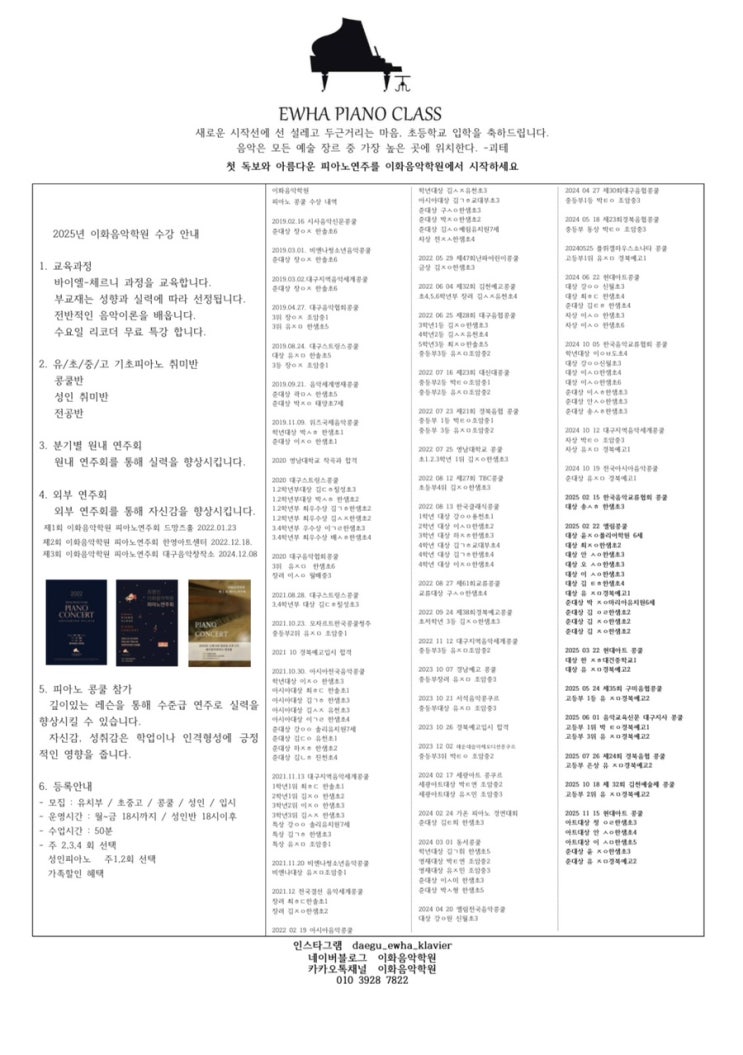 이화음악학원 ❤️2026 신학기 피아노 신입생 모집❤️ 상담예약 안녕하세요 이화음악학원 2026년 신규수강생 모집 합니다. -모집대상 : 예비초1 , 초중고 , 성인피아노 수강과목 : 기초 클래식피아노 , 고학년 한곡완성 수업시간 : 학기중 : 하교후바로 / 방학 : 1시부터 - 초중고 취미피아노반 - 초등학생 예비전공반 - 초,중학생 전공반 (예고 입시 준비) - 성인피아노 / 주1,2회 대면상담 상담시각 예약 후 방문 부탁드립니다:) 상담시간 : 월~금 오후12:30 010 3928 7822 #한샘초피아노 #신월초피아노 #한솔초피아노 #용천초피아노 #달서구성인피아노 <2025년도 이화음악학원 콩쿨 수상 내역> 2025 02 15 한국음악교류협회 콩쿨 대상....... <img src="https://blogthumb.pstatic.net/MjAyNjAyMDFfMjcx/MDAxNzY5OTEwODQ1NjYw.lB021xUrHnbcRGj8VbZismonP87Pws9VWF_64CaRdhog.rlMjhCTjZ06q0mclTJiqHpWzgfjI5zVpaq6jpTUVFtYg.JPEG/IMG%A3%DF3958.jpg?type=s3" />