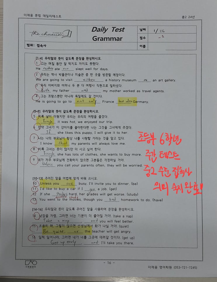 저희 더채움 영어에는 열정적인 ‘중3 및 고등부’ 강사님들의 수업도 있지만 내 아이처럼 아끼며 (방향성 회의 정말 많이함) 사촌언니, 누나처럼 수업해주시는 ‘초/중등부’ 선생님들도 계시다는 사실! 저희 더채움 영어 초/ 중등부의 강점으로 말하자면 1. 모든 학년을 현행/선행으로 나누어 소수 정예 수업을 진행합니다 2. 결국 고등부 1등급이 목표인 장기 마라톤임을 알기에 단순 초중 수준이 아닌 ‘고등부 대비 장기 영어학습 플랜’ 으로 구성한 커리큘럼으로 진행됩니다 파닉스를 완료 한 초등 고학년들은 이제 새롭게 영어학습을 시작해볼 시간이겠죠?! 3. 매주 배운 문법 내용을 타겟으로 하는 ‘자체 주간 평가’와 한 달간 배운 내....... <img src="https://blogthumb.pstatic.net/MjAyNjAyMDJfOTMg/MDAxNzcwMDA2MzQ4MTQy.XH5ZKHHcxrGG9xH_YhSUJ_F9exwF-RMMd7Ty-cO2dzcg.Z-uWw6nrEtOpn-96lMMOqSSZBvd9RMhBVWt0o6A2UpEg.JPEG/KakaoTalk_20260202_132159964.jpg?type=s3" />