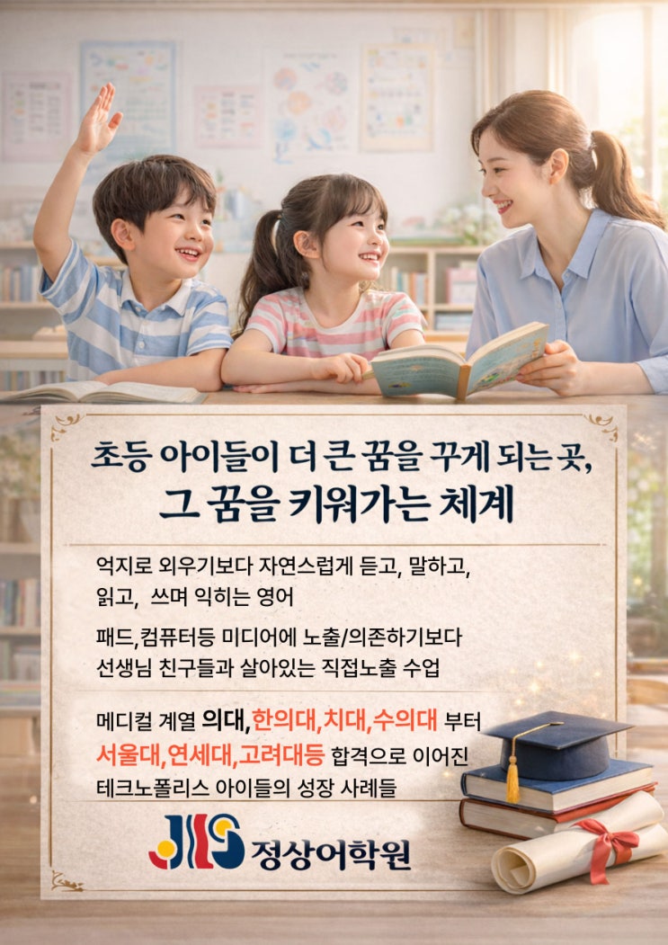 초등 영어는 단순히 공부를 시작하는 시기가 아니라 아이의 가능성과 방향이 만들어지는 시기라고 생각합니다. 요즘 신학기 초등학생 학부모 상담을 하다 보면 “아직 초등인데 너무 공부처럼 시키고 싶지는 않아요” “그래도 체계는 있었으면 좋겠어요” 이런 고민을 정말 많이 들었습니다. 그래서 더 고민하게 됩니다. 아이들이 영어를 어떻게 시작해야 할지에 대해서요. 저희는 아이들이 영어를 억지로 외우기보다 자연스럽게 듣고, 말하고, 읽고, 쓰며 하나의 언어로 받아들일 수 있도록 100%영어로 재미있는 수업을 진행하고 있습니다. 특히 패드나 컴퓨터 같은 미디어에 의존하기보다 선생님, 친구들과 함께 영어로 소통하며 수업 시간 자....... <img src="https://blogthumb.pstatic.net/MjAyNjAzMjRfMTgz/MDAxNzc0MzM0OTczMzI4.ma5sn33isAbX6_ucO4KAHDHJeSyOD2PkGbiuxVj4IFAg.a43TVYQxwl6H6DWha64ZX2uxsdKcY0I1-O6TrbkQAf8g.JPEG/%C1%A6%B8%F1%C0%BB-%C0%D4%B7%C2%C7%D8%C1%D6%BC%BC%BF%E4_-001_%281%29.jpg?type=s3" />