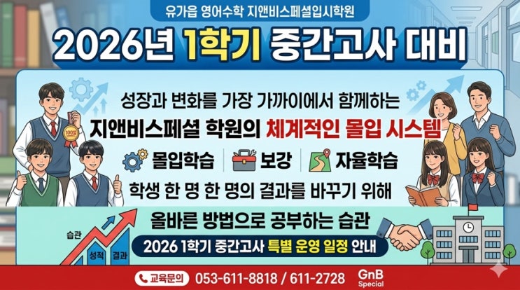 안녕하세요. 유가읍 영어수학 지앤비스페셜입시학원입니다. 항상 학생들의 성장과 변화를 가장 가까이에서 함께하는 유가읍 영어수학 지앤비스페셜입시학원에서 2026년 1학기 중간고사를 대비한 몰입학습 · 보강 · 자율학습 운영 일정을 안내드립니다. 이번 중간고사는 단순한 시험이 아닌 학습 습관과 성적 흐름을 결정짓는 중요한 분기점입니다. 유가읍 영어수학 지앤비스페셜입시학원은 학생 한 명 한 명의 결과를 바꾸기 위해 체계적인 몰입 시스템을 운영합니다. 시험 대비 운영 일정 안내 ✔ 주중 운영 (3월 30일부터 시험 종료 시까지) •수업 전후 오후 9:30까지 학습 진행 •수요일은 오후 8:30까지 운영 •저녁 식사 시간 : 7:00 ....... <img src="https://blogthumb.pstatic.net/MjAyNjAzMzBfMTc1/MDAxNzc0ODUxNDg5MjMw.GC2PDKKv7wn8RAr_SMpWDL9rpp_OdfLPnGdhJsxtME0g.5zMDJihCpxen6uryFBdXI-tWzJreWUAbrhPEYJfvMOkg.JPEG/IMG%A3%DF6871.jpg?type=s3" />