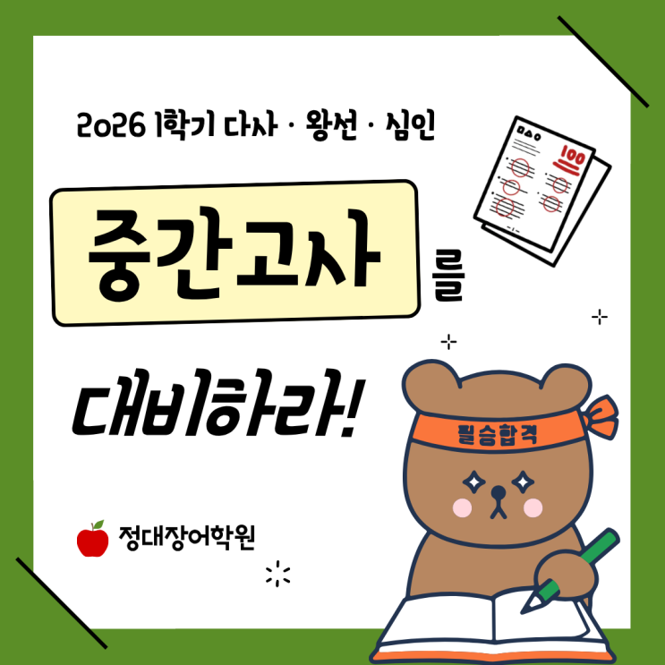 안녕하세요 대구 다사 세천 초등·중등·고등 영어 전문 정대장 어학원입니다. 새 학기에 좀 적응됐나 싶더니, 벌써 1학기 중간고사가 한 달 앞으로 다가왔네요 이번주에 있는 영어 듣기 시험을 시작으로 본격적인 시험 준비를 해야 할 때입니다. 한 번 같이 살펴볼게요~ 각 학교 중간고사 시험 일정 다사중/심인중: 4/29(수) ~ 30(목) 왕선중: 4/28(화) ~ 29(수) 2. 영어 내신 학습법 • 중등 영어 내신은 교과서 본문이 핵심입니다. - 눈으로 보면 쉬운 내용이고, 대충 해석이 가능하여 다 안다고 착각할 수 있습니다. - 교과서 자습서 & 평가 문제집으로 실전 감각을 기르세요!! • 같은 교재라도 학교마다 출제 스타일이 달라 기출 분....... <img src="https://blogthumb.pstatic.net/MjAyNjAzMzBfMjU5/MDAxNzc0ODQ5NDczOTEw.M9vn-gW59HMC9OX-qrhl4tZpMwUZd2N9KjXe6-cULVkg.luRQrDPp09kbTDd-TaHZTn_vwogQhYOaYT7FsBkRbHMg.PNG/2.png?type=s3" />