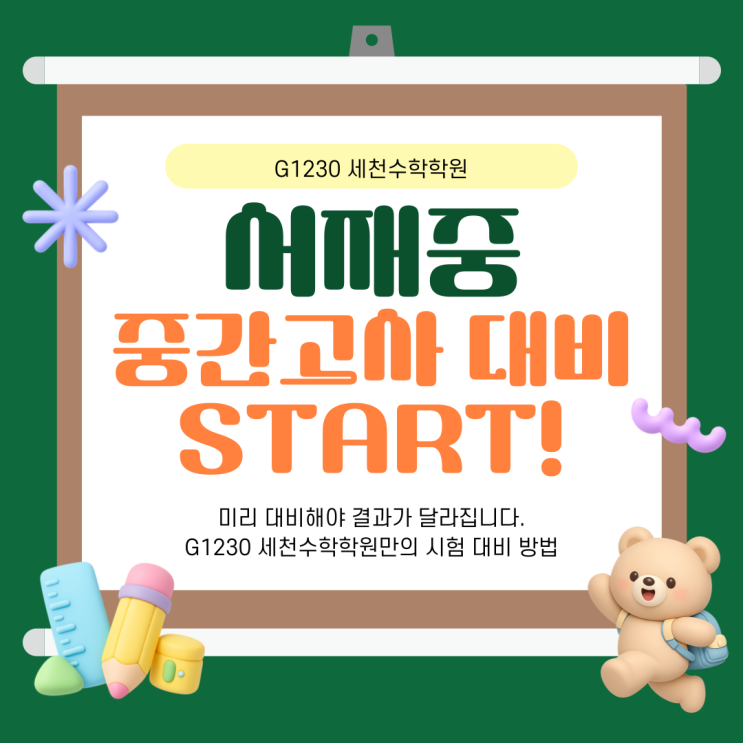G1230 세천수학학원만의 시험 대비 방법 '서재중 중간고사 대비 시작' 3월 말, 이 시기쯤 되면 학부모님들께서 가장 많이 하시는 말이 있습니다. “아직 시험 멀지 않았나요?” 하지만 실제로는 지금부터 준비를 시작한 학생과 시험 직전에 시작한 학생의 결과는 완전히 달라집니다. 정답은 명확합니다. 지금, 3월부터입니다. 시험기간은 보통 3~4주 전부터 시작되지만 그때는 이미 ‘정리 단계’여야 합니다. ✔ 개념이 완성된 상태 ✔ 문제풀이가 어느 정도 진행된 상태 ✔ 취약 단원이 파악된 상태 이 3가지가 되어 있어야 시험 직전에 점수를 끌어올릴 수 있습니다. 많은 학생들이 시험 2주 전부터 급하게 시작합니다. 하지만 그때....... <img src="https://blogthumb.pstatic.net/MjAyNjAzMzFfMTY1/MDAxNzc0OTQzMTQxNzM1.E3uX-UFUUqCETbmAGQLVwDMaKJg666mucIwArCTuk4Mg.Rd_qnpr7dy5nxbcwDG8Y33olRIxZkoQ6KaiycxJkUyEg.PNG/%C1%A6%B8%F1%C0%BB-%C0%D4%B7%C2%C7%D8%C1%D6%BC%BC%BF%E4_-001_%281%29.png?type=s3" />