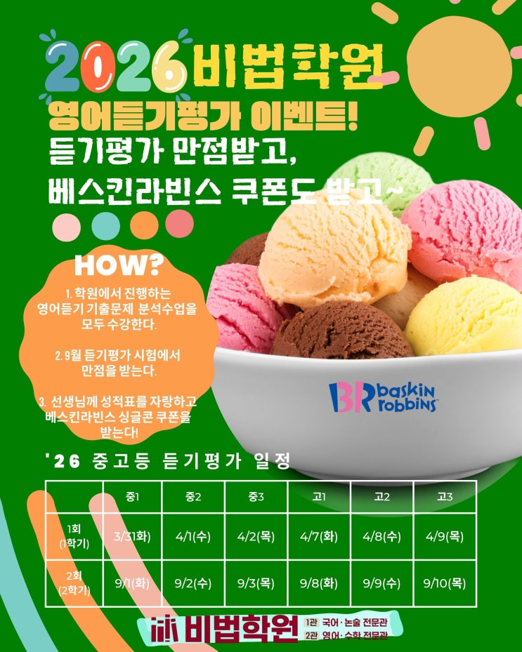 2026 #비법학원 중고등 영어과정, #영어듣기평가 이벤트! 듣기평가 만점받고, #베스킨라빈스 쿠폰도 받고~ 어떻게 참여할까요? 하나! 학원에서 진행하는 영어듣기평가 3개년 기출문제 분석수업을 모두 수강한다. 둘! 9월 듣기평가 시험에서 만점을 받는다. 셋! 선생님께 성적표를 자랑하고 베스킨라빈스 싱글콘 쿠폰을 받는다! #구지면 #국가산단 #비법학원에서는 3개년 듣기 기출문제 풀이, 스크립트 분석, 복습자료 및 필수어휘 자료까지! 듣기평가 완벽대비, #구지중 #내신대비 역시 비법학원(#구지면, #국가산단) #비법학원은 지역내 최고 수준의 강사진이 최적의 수업을 제공합니다. <img src="https://blogthumb.pstatic.net/MjAyNjAzMzFfMTk2/MDAxNzc0OTM0MDI1MzQ5.FoDuE9C-peXml2SV_RRrvCfN8VzgwPLm-Vta9-pOXYwg.Vw--ba1kfupa-c7b5MUdktYgtt5UpiS-s7JV4_KXX6Ug.JPEG/26%B5%E8%B1%E2%C6%F2%B0%A1_%C0%CC%BA%A5%C6%AE01.jpg?type=s3" />