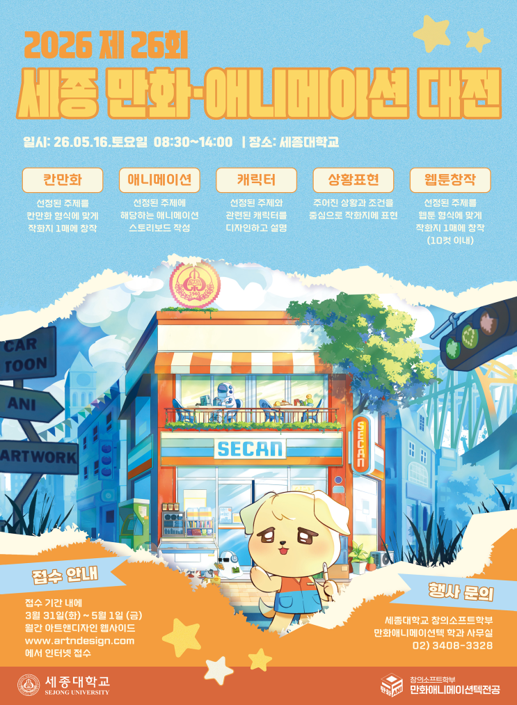 안녕하세요! 인천 미추홀구 미대입시 전문 미술학원 인천남부송도입시본원 직영 주안 하이파이브 미술학원 & 애니하이 입니다. 이번 포스팅에서는 2026 세종대학교 제26회 세종만화애니메이션 대전 개최소식을 전달드리겠습니다. | 전형 칸만화, 애니메이션, 캐릭터, 상황표현, 웹툰창작 | 주최 세종대학교 창의소프트학부 만화애니메이션텍전공 | 일시 2026년 5월 16일(토) 8:30 ~ 14:00 | 참가자격 전국 고등학교 재학생 및 고등학교 졸업생 또는 동등이상의 학력 소지자 | 접수방법 온라인접수 | 접수기간 2026년 3월 31일(화) 00:00 ~ 5월 1일(금) 24:00 | 접수처 월간 아트앤디자인 | 참가비 45,000원(인터넷 접수비 별도) ※ 전체 1,60....... <img src="https://blogthumb.pstatic.net/MjAyNjA0MDFfNDcg/MDAxNzc1MDIxMDA2MjIw.86ZpM7fz4IRGAI59XDOR_IxKQlTdE6PlFsghFuFSP5Ug.uY7Q1OMFszApw4tlYXz7Fuk09T-nRkMmaGr_vcGqYqAg.PNG/poster.png?type=s3" />