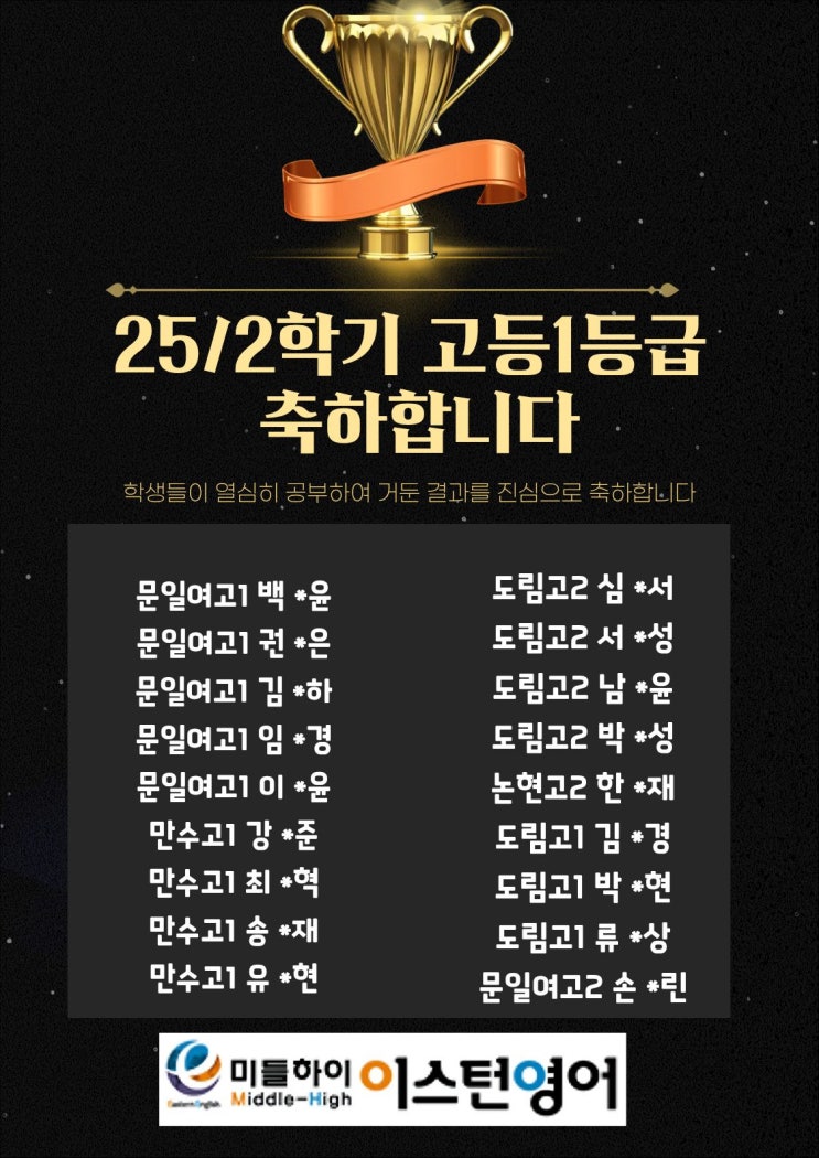 안녕하세요 서창동 영어학원, 서창동 중고등 영어의 강자 20년 전토의 미들하이 이스턴영어학원입니다 오늘은 "25년 2학기 고등 성적 우수자 안내"와 26년 1월 16일(금) 오늘 2회에 걸쳐 시행했던 "집에서 만나는 캠퍼스 멘토 학생캠프"에 대해 글을 작성합니다. 25학년 2학기 고등내신 영어 1등급 성적 우수자 미들하이 이스턴영어학원과 함께 하면서 고등학교 내신 영어에서 1등급을 성취한 자랑스러운 학생들입니다. 25년 수고 많았고 더 반짝 반짝 빛날 26년을 응원합니다. 1등급을 성취했던 학생들 뿐만아니라 열심히 노력하고 공부해서 점수향상, 등급향상, 영어 실력향상을 이룬 모든 미들하이 이스턴영어학원의 고등....... <img src="https://blogthumb.pstatic.net/MjAyNjAxMTZfNjMg/MDAxNzY4NTcyMTY1MDM5.OqtCnkwtSoAbHWl4wWoTa2PwUANQUYikxQNBV0Oebc0g.x7VVVGSMSFGq9ag_HGV3LC2htU0dbfzdZe5GxHUAyeMg.JPEG/26%B3%E2_1%BF%F9_%BA%ED%B7%CE%B1%D7_%C0%CC%B9%CC%C1%F6.jpg?type=s3" />