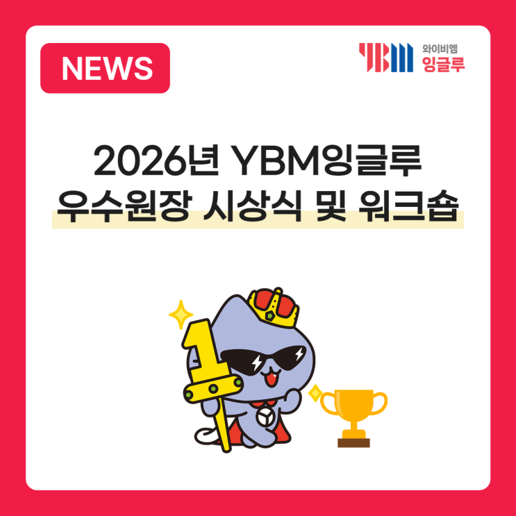 안녕하세요 YBM잉글루입니다~! 지난 주말, 전국 각지에서 우수 원장님들께서 한자리에 모인 「2026년 YBM잉글루 우수원장 워크샵」이 YBM연수원에서 성황리에 진행되었습니다. 이른 아침부터 먼 길을 마다하지 않고 참석해주신 원장님들 덕분에 현장은 시작부터 열정과 에너지로 가득했는데요, 먼길 와주신 원장님들을 위해 샌드위치를 준비하여 작지만 따뜻한 환영의 마음을 전하고자 했습니다 2026년도 YBM잉글루 비전 발표 워크샵의 시작은 이정철 상무님의 ‘2026년도 YBM잉글루 비전 발표’로 열렸습니다. 급변하는 교육 환경 속에서 YBM잉글루가 나아갈 방향과 캠퍼스와 함께 성장하기 위한 중장기 로드맵을 공유하는 시간이었으....... <img src="https://blogthumb.pstatic.net/MjAyNjAxMTlfMjc2/MDAxNzY4Nzk5ODQ3NjYy.yzuP1BclbTDoTLCThcVfS_i022Thkjye9fnn2frS5Xog.JFqZq61TtettcevS3mqiF8ESOMNUn7oUZRv2tMJzntwg.PNG/%BA%B9%BB%E7%BA%BB_%BD%E6%B3%D7%C0%CF_%285%29.png?type=s3" />