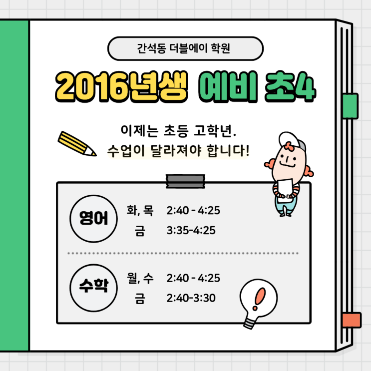안녕하세요. 간석동 더블에이학원입니다! 2026년 병오년, 새해 알차게 잘 보내고 계실까요? 오늘은 저희 더블에이 학원에 올해 고학년이 되는 2016년생들을 위한 '예비 초4'반이 있다는 것을 안내드리려고 해요! 예비 초4 영어 ) 화, 목 2:40 - 4:25 / 금 3:35 - 4:15 수학 ) 월, 수 2:40 - 4:25 / 금 2:40 - 3:30 지금 초등 고학년이 된 이 시기! 기초부터 탄탄히 쌓아나가면서 공부 습관을 형성하기 너무 좋은 시기예요. 오랜 시간 앉아있는게 어렵고 스스로 공부하는 것이 어려운 초등학생들에게 큰 도움이 될거라고 생각합니다. :) 저희 더블에이 학원은 레벨테스트를 통해 학생들 개별 수준을 파악하여 수업을 진행하고 있습니다....... <img src="https://blogthumb.pstatic.net/MjAyNjAxMTlfOSAg/MDAxNzY4ODA5NTg0MDIy.4wgZGBLG66EyQCKvAaS6jrGtO7YrK-aKZKH2KAmjzGIg.8Bd556bgcI2AjIsut-2EL_fylAywhAO7plJ3TRdmnYwg.PNG/2026_%BF%B9%BA%F1%C3%CA4.png?type=s3" />