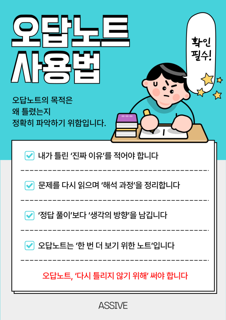 안녕하세요, 만수동 어시브수학학원입니다 수학 공부를 하다 보면 “오답노트는 꼭 만들어야 하나요?” 라는 질문을 자주 받습니다. 하지만 사실 더 중요한 질문은 이것입니다. 지금 오답노트를 어떤 방식으로 쓰고 있나요? 틀린 문제를 다시 풀어 적기만 하는 오답노트는 시간은 많이 들지만 성적 향상으로 이어지지 않는 경우가 많습니다. 오답노트의 본래 목적은 문제를 다시 푸는 데 있는 것이 아니라, 왜 틀렸는지를 정확히 짚어내는 데 있습니다. 오늘은 그 사용법에 대해 천천히 짚어보겠습니다 ① 내가 틀린 ‘진짜 이유’를 적어야 합니다 오답노트를 쓸 때 가장 먼저 해야 할 일은 틀린 이유를 최대한 자세히 적는 것입니다. ②....... <img src="https://blogthumb.pstatic.net/MjAyNjAxMjBfMzEg/MDAxNzY4ODkyODAyMjYz.MSG84HyoH19vo3C7qJRHeakRra3rK2tPsvxbIj_iXlwg.UPz8ZJ0sWNX90vMiHONAMGuof7rv3wPsB-QvwDCiXMwg.PNG/%C1%A6%B8%F1%C0%BB%A3%AD%C0%D4%B7%C2%C7%D8%C1%D6%BC%BC%BF%E4%A3%DF%A3%AD001_%A3%AD_1%A3%A812%A3%A9.png?type=s3" />