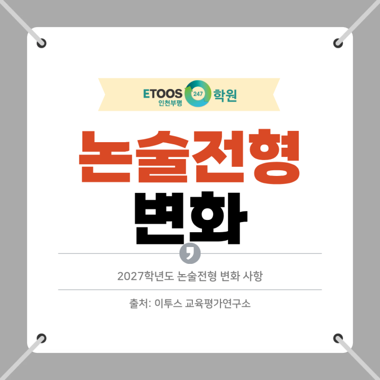 안녕하세요! 부평 독학 재수학원 이투스247 인천부평점입니다 :) 대학에 가는 길은 크게 수시와 정시로 나뉩니다 그중 수시는 다시 학생부종합(학종), 교과, 그리고 논술전형으로 세분화되죠. 현역 고3들에게는 학종과 교과가 주력이지만, 내신의 불리함을 딛고 역전을 노리는 학생들에게는 논술전형이 가장 인기가 많습니다. 오늘은 그 논술전형의 2027학년도 변경사항을 주요 35개 대학부터 의약학계열까지 이투스 교육평가연구소의 자료를 통해 모두 알아보도록 하겠습니다! 가장 먼저 주요 35개 대학입니다. 본격적인 세부 분석에 앞서, 어떤 대학들이 변화의 중심에 있는지 카테고리별로 먼저 짚어보겠습니다! 각각의 카테고리는 최저학력기....... <img src="https://blogthumb.pstatic.net/MjAyNjAzMjhfMTUw/MDAxNzc0Njc5ODEyMzg1.kmIHvQpqo3QrqrI_P5ilx1CRU7sudW337zyD--X-BfEg.1OcCQZWz2_RA9MIOq6v40FiezwDqIilSLYmPOpOhAjUg.PNG/1.png?type=s3" />