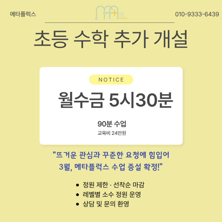 [메타플럭스] 교과 수학반 정원 마감으로 3월 추가 증설 안내