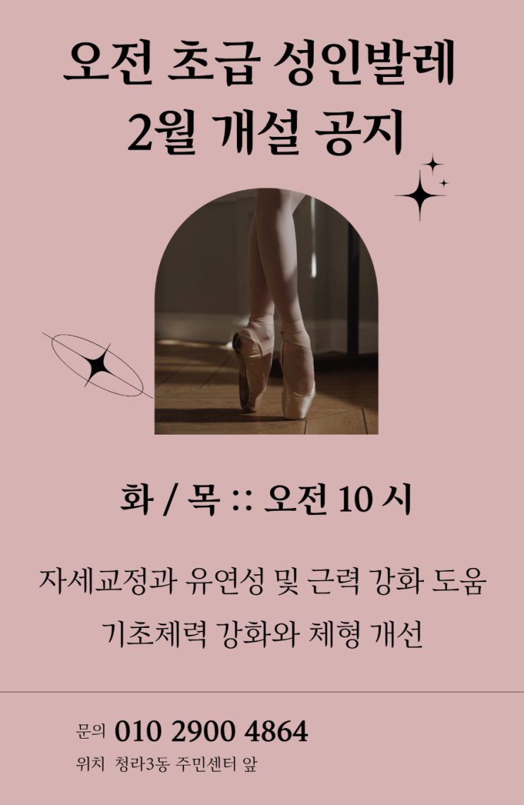 월ㆍ수 오전10시 타임은 모집마감 되어 화ㆍ목 오전10 시타임을 모집합니다 ☺️ 최소정원은 3명 /최대인원은 7 명입니다. 한달결제시 20 만원 / 세달 결제시 16만원입니다. #청라성인발레 #청라초보성인발레 #청라댄스 #청라필라테스 #청라운동 #청라요가 #청라초급발레 <img src="https://blogthumb.pstatic.net/MjAyNjAxMTZfMjk3/MDAxNzY4NTUxMzUxMTc3.WphJbb0BVfKQCzM4elYk4mpBIwRfn8T31F554qz_pygg.j60MuN3_smi-I0OS5Hw1-K0vvSZO4qhFQnVDXaq7Pqsg.PNG/900%A3%DF1768551295389.png?type=s3" />