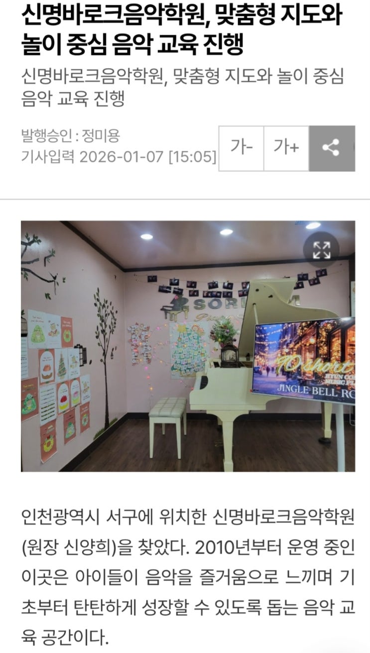 ⭐아이들이 음악으로 빛이 나는 공간⭐ 신명바로크음악학원입니다 우리 학원이 소상공인 온라인 신문사 베스트타임즈 에서 검암동 음악학원 중 선택되어 인터뷰를 진행했어요. 그래서 온라인 기사가 실리는 뜻깊은 경험을 하게 되었어요. 그동안 아이들과 하루하루 쌓아온 경험과 시간이 이렇게 기사로 소개되어 큰 보람을 느꼈어요. “음악은 실력보다 경험이. 먼저입니다” 기사에서는 신명바로크음악학원이 맞춤형 지도와 놀이 중심 음악 교육을 통해 아이들이 음악을 즐겁게 느끼며 기초부터 탄탄하게 성장할 수 있도록 돕고 있다는 점을 집중적으로 다뤄주셨습니다. 저 역시 오랜 음악 공부를 통해 ‘실력보다 먼저 좋은 경험이 있....... <img src="https://blogthumb.pstatic.net/MjAyNjAxMjBfMjQ3/MDAxNzY4OTAwMDY0NDU1.kSA3NkJV4igVuY6Rer4sCz2HubXrLtQV6zeicMrbRmcg.O3s-cxRoorjn8b-Z6LxY9nuabqXKgiWE5r7Czt7c32Ig.JPEG/900%A3%DFScreenshot%A3%DF20260120%A3%DF144704%A3%DFKakaoTalk.jpg?type=s3" />