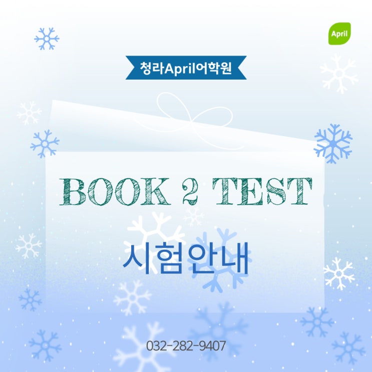 [청라April어학원] 겨울학기 BOOK2 TEST 안내 ✅ 시험 일정: 1월 한 달 동안 학습한 Class Book 내용을 바탕으로 진행 ✅ 시험 유형: Lesson 1-8 내용 기준 Listening 10문제 Reading 10문제 ️ I-learning에서 온라인 응시 필수! 시험 전 수업 내용 복습 필수! 크레버스 러닝포털 사이트에서 진행됩니다. 문의: 청라April어학원 032-282-9407 <img src="https://blogthumb.pstatic.net/MjAyNjAxMjNfMTQ5/MDAxNzY5MTQyMTcxMzc3.HIjDV7_HkcKh0pCoyHWwSfVVetCZXCTUtPYN92UF3-Ug.xI_kWsRL5LNU6efl3GwxQhgpgkX4qeHnXb_DBccxpBUg.JPEG/002.jpg?type=s3" />